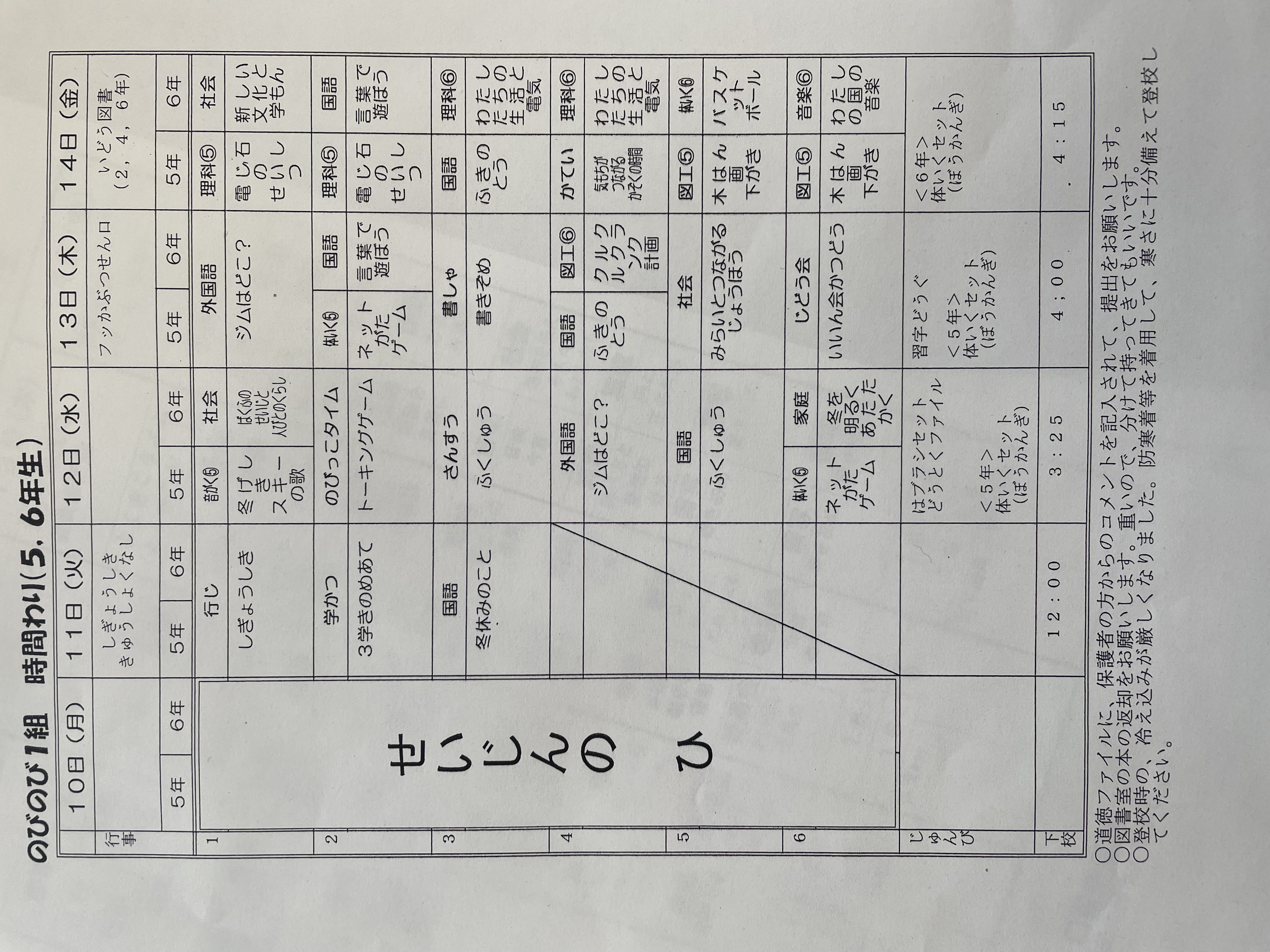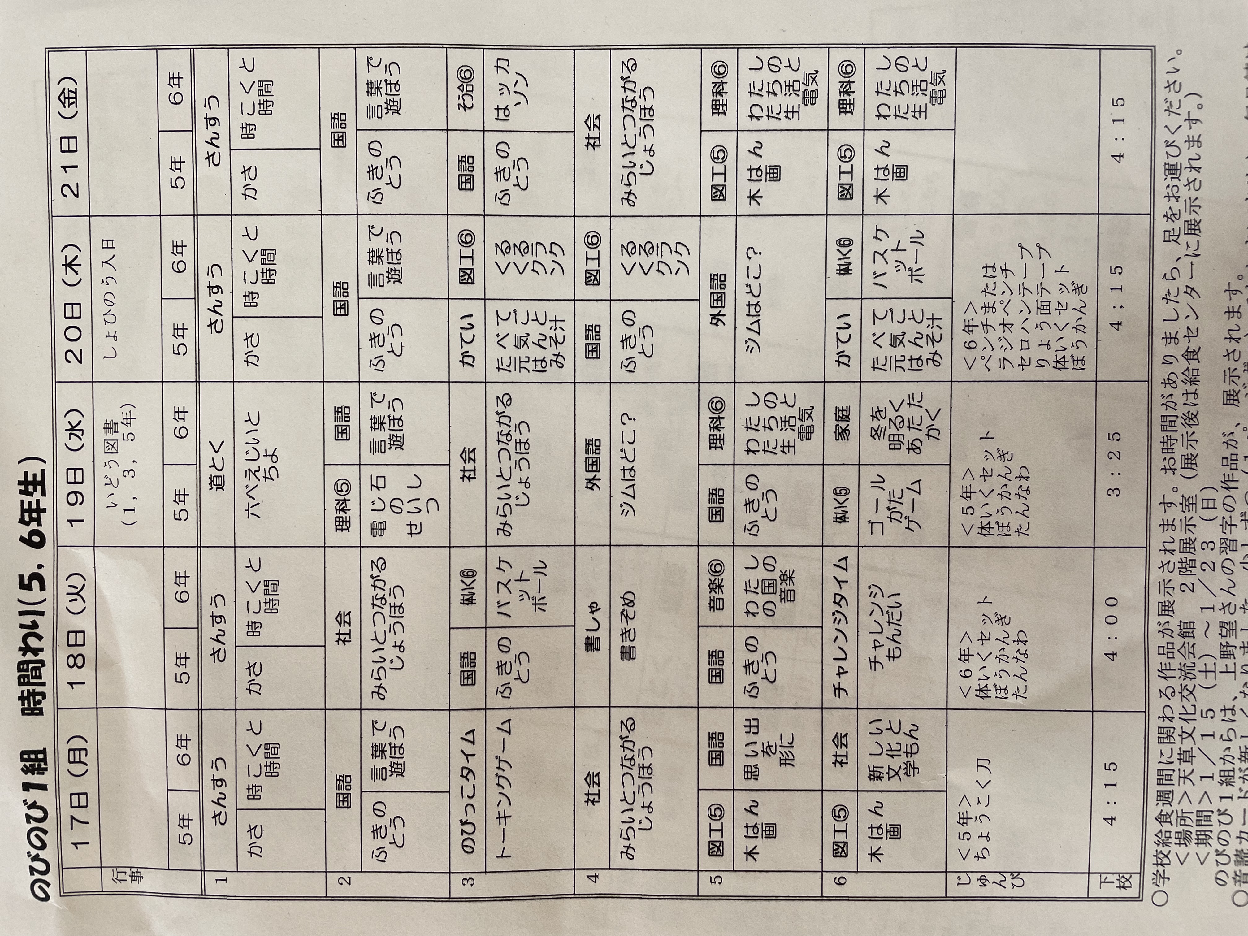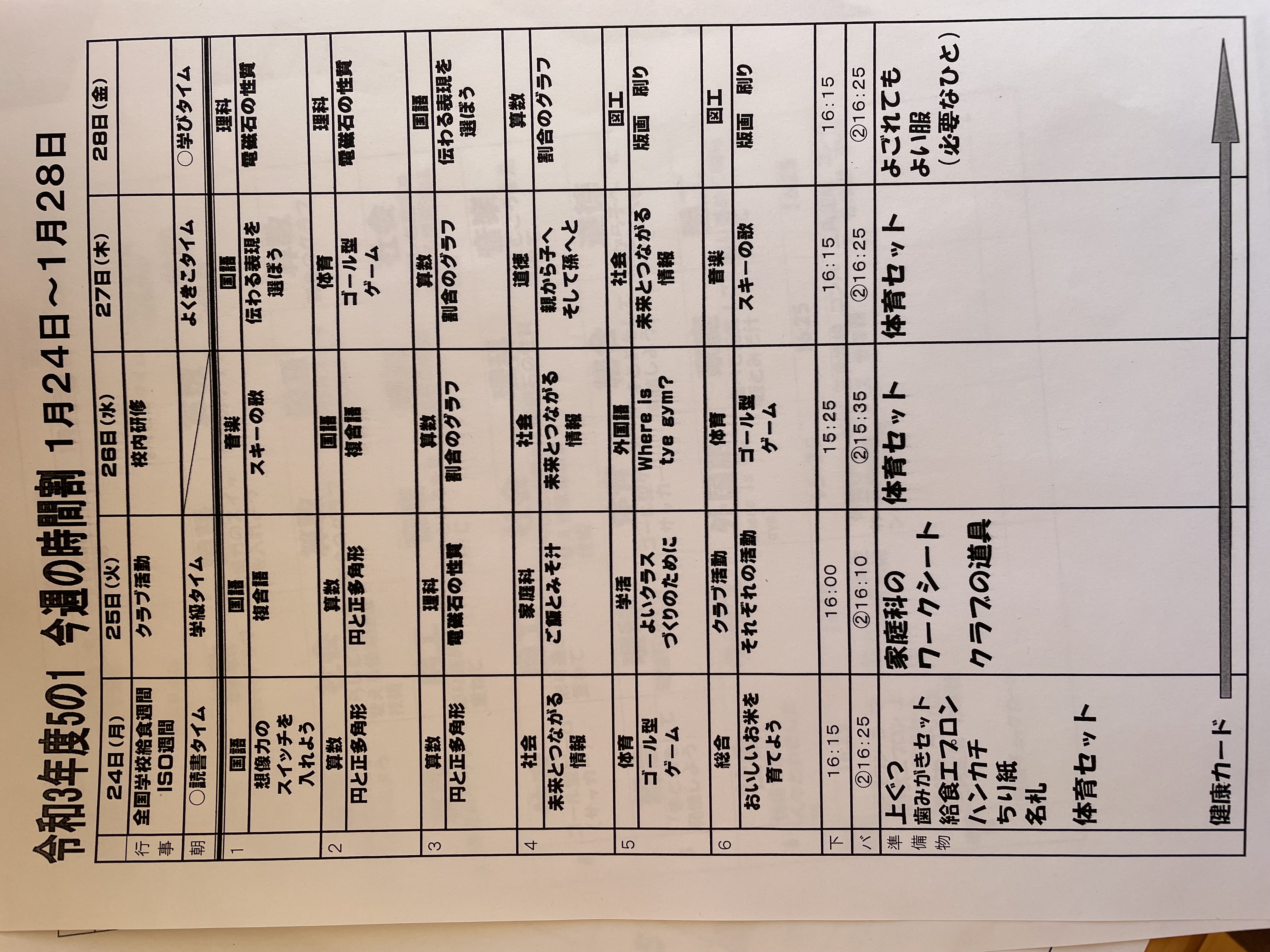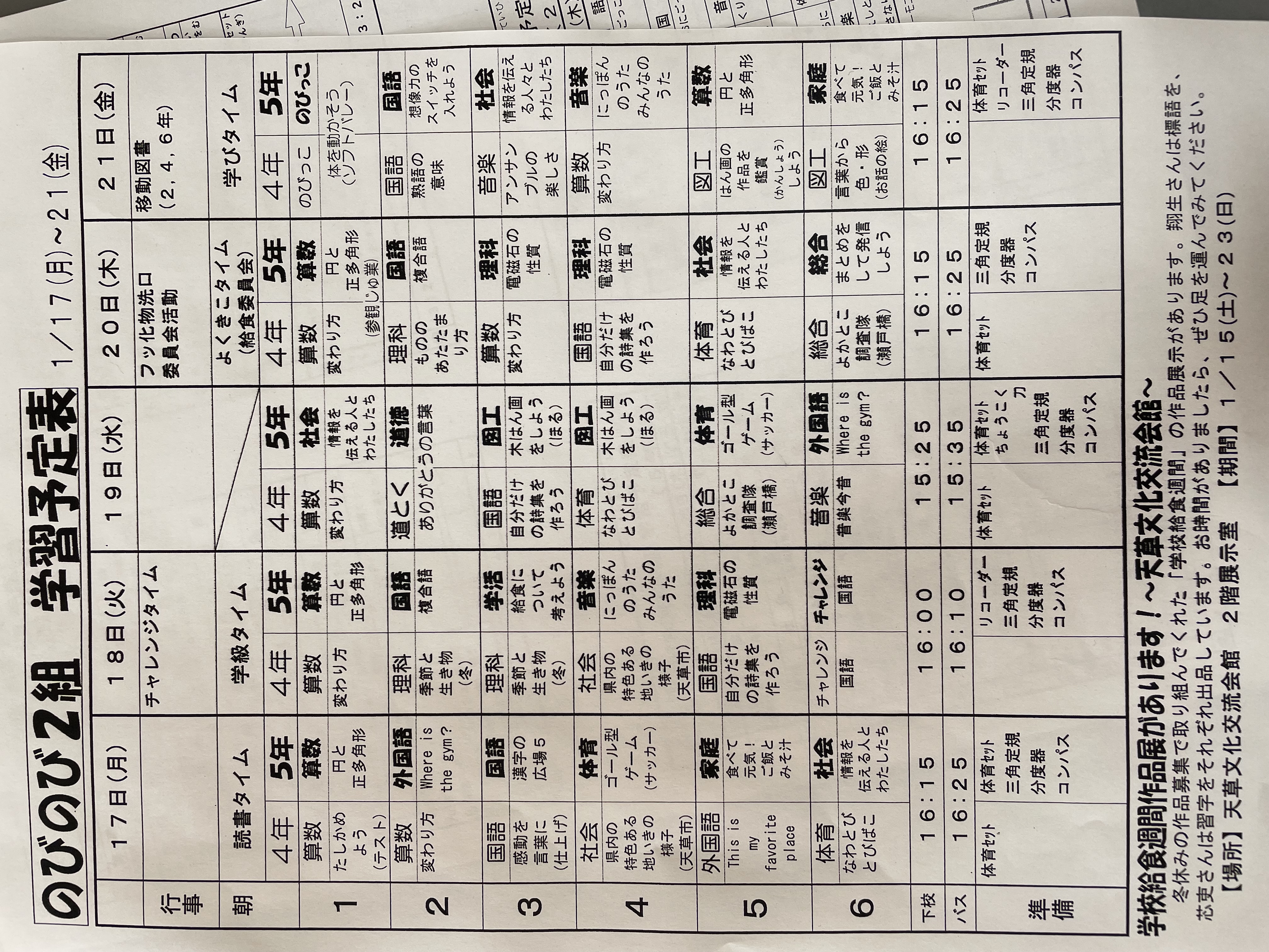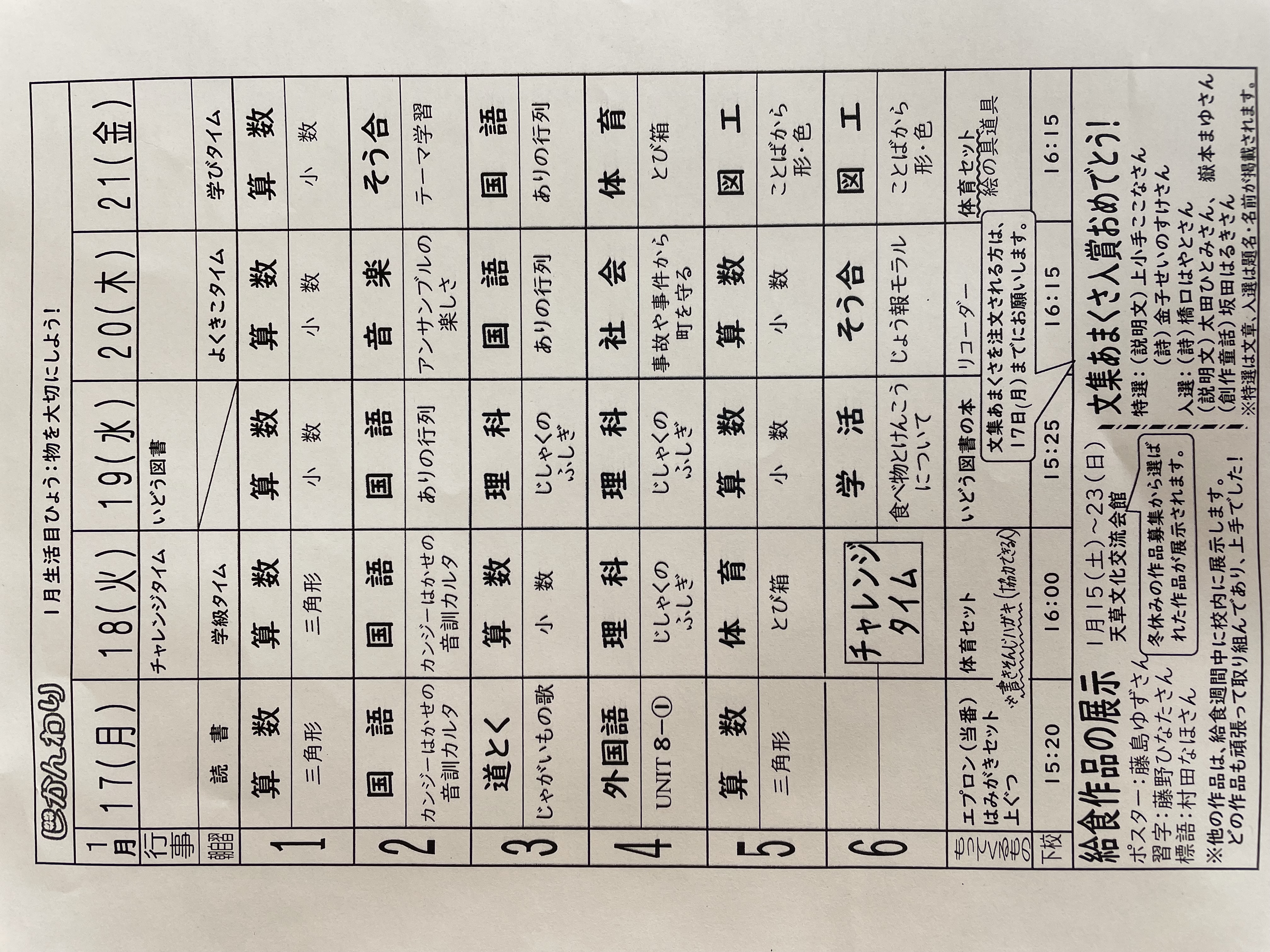 1月17日から1月21日までの時間割 投稿日時 : 2022/01/14 学校サイト管理者 1年1組.JPG 1年2組.JPG 2年1組.JPG 3年1組.JPG 4年1組.JPG 5年1組.JPG 5年2組.JPG 6年1組.JPG の1組1年.JPG の1組3年.JPG の1組5年6年.JPG の2組4年5年.JPG の3組1年.JPG の3組2年.JPG の3組3年.JPG の3組5年.JPG