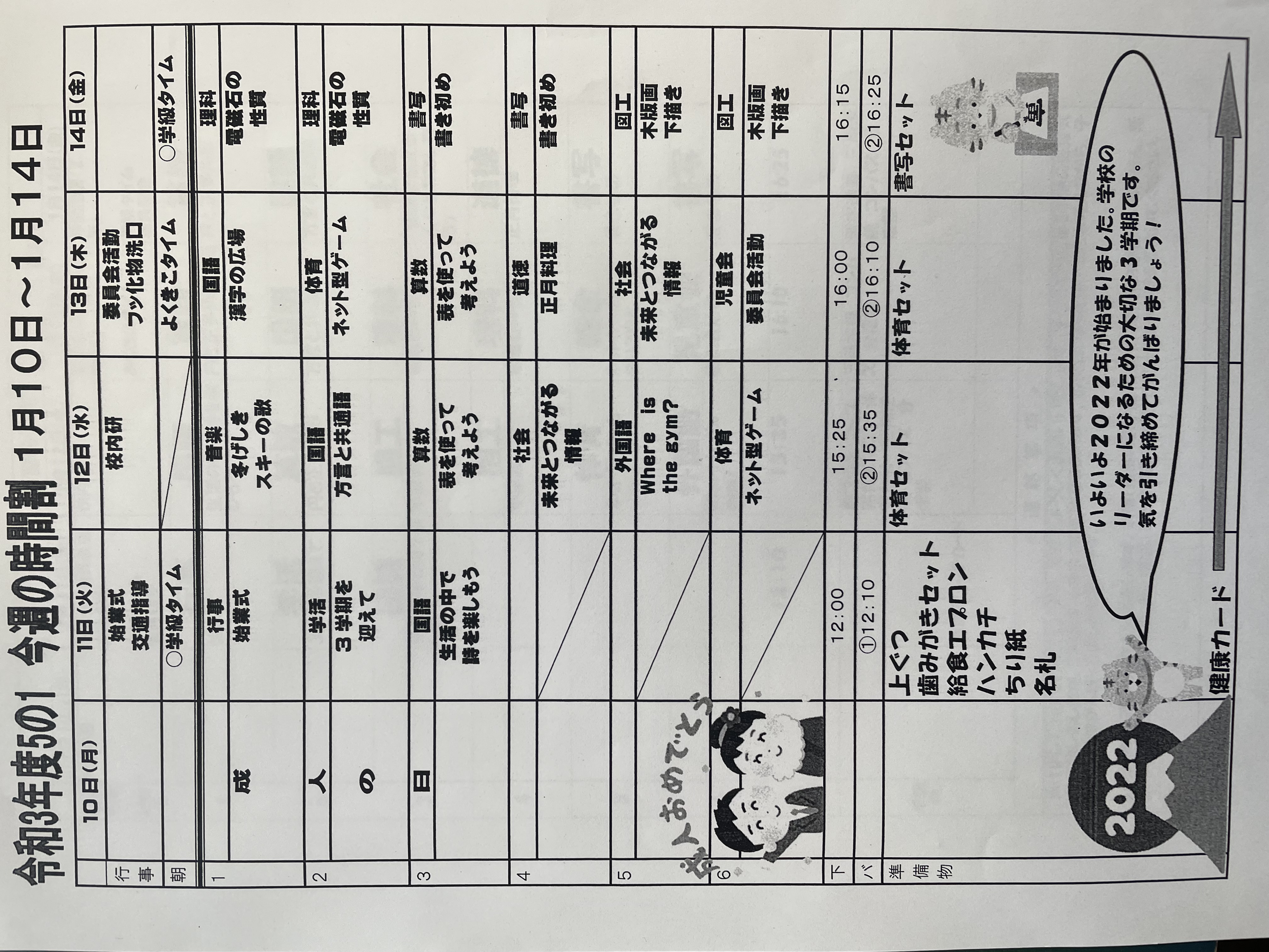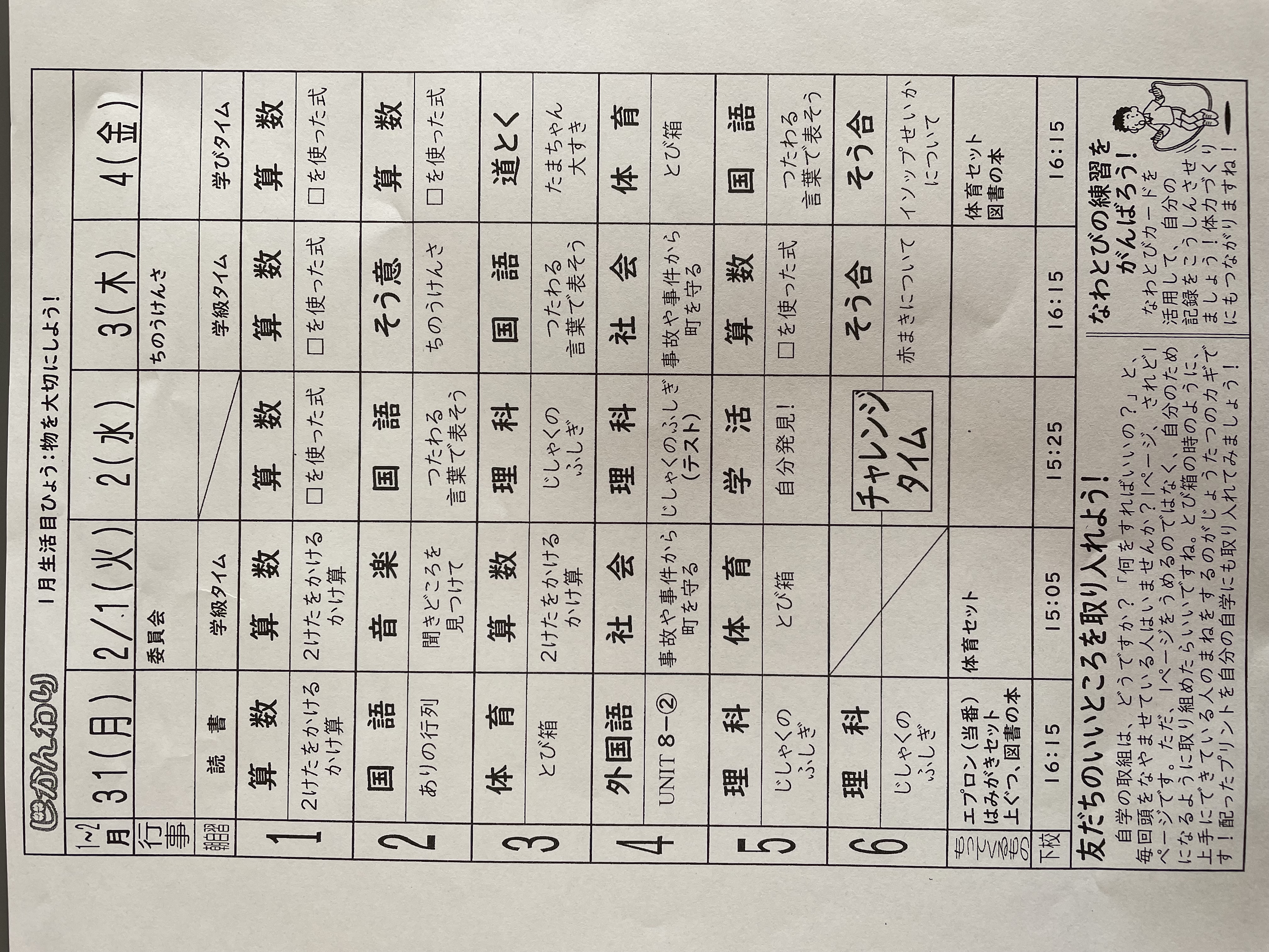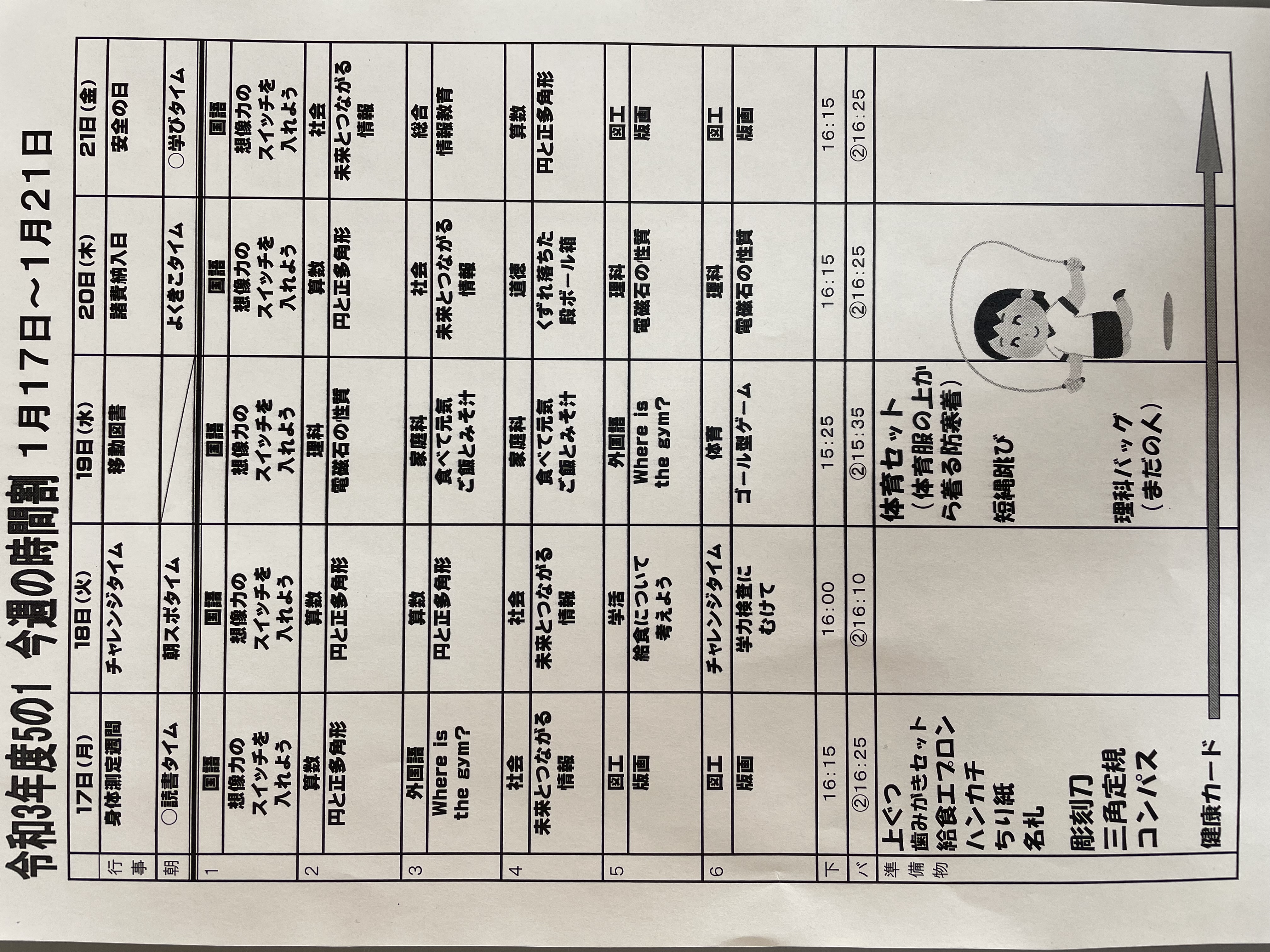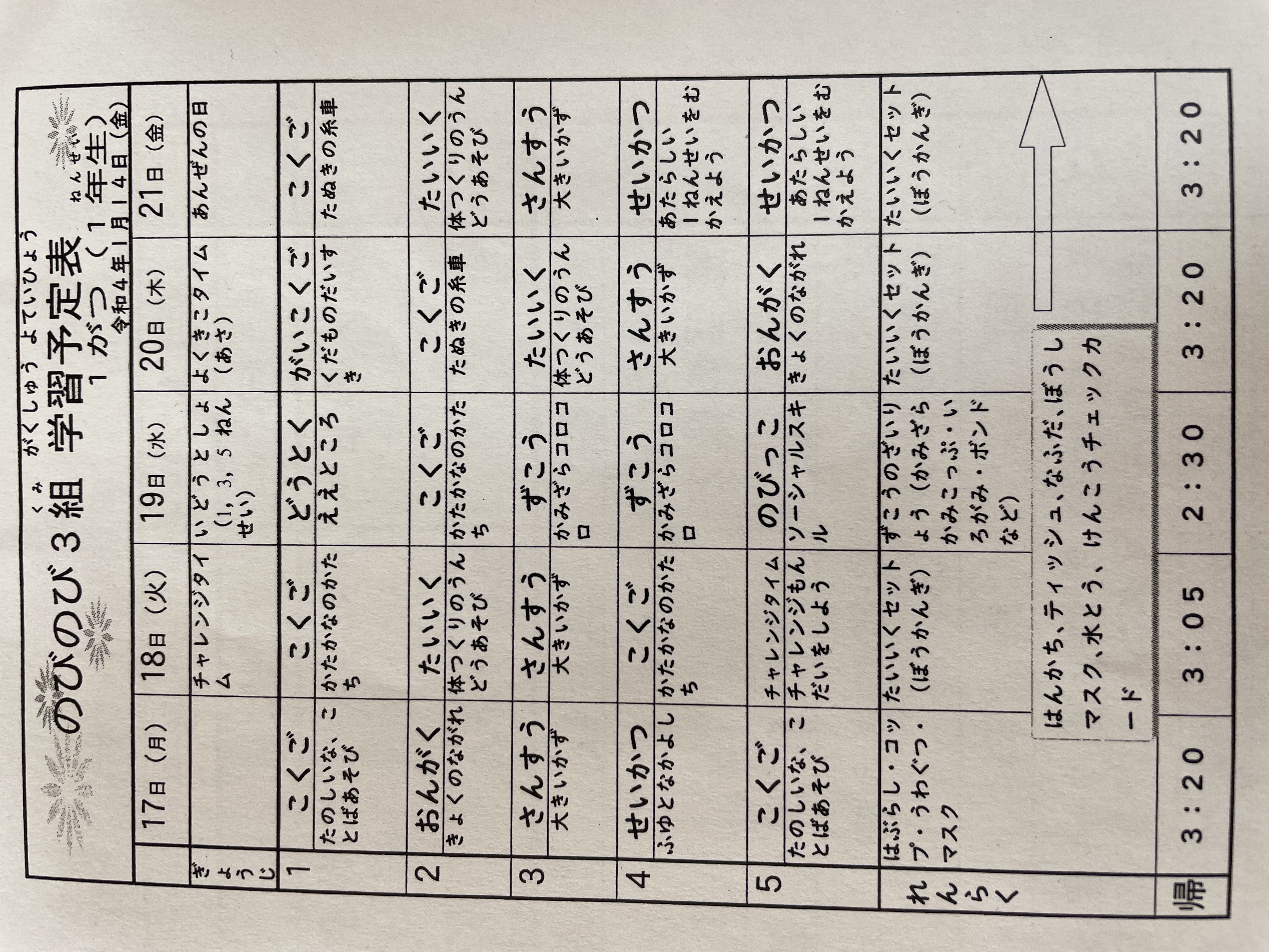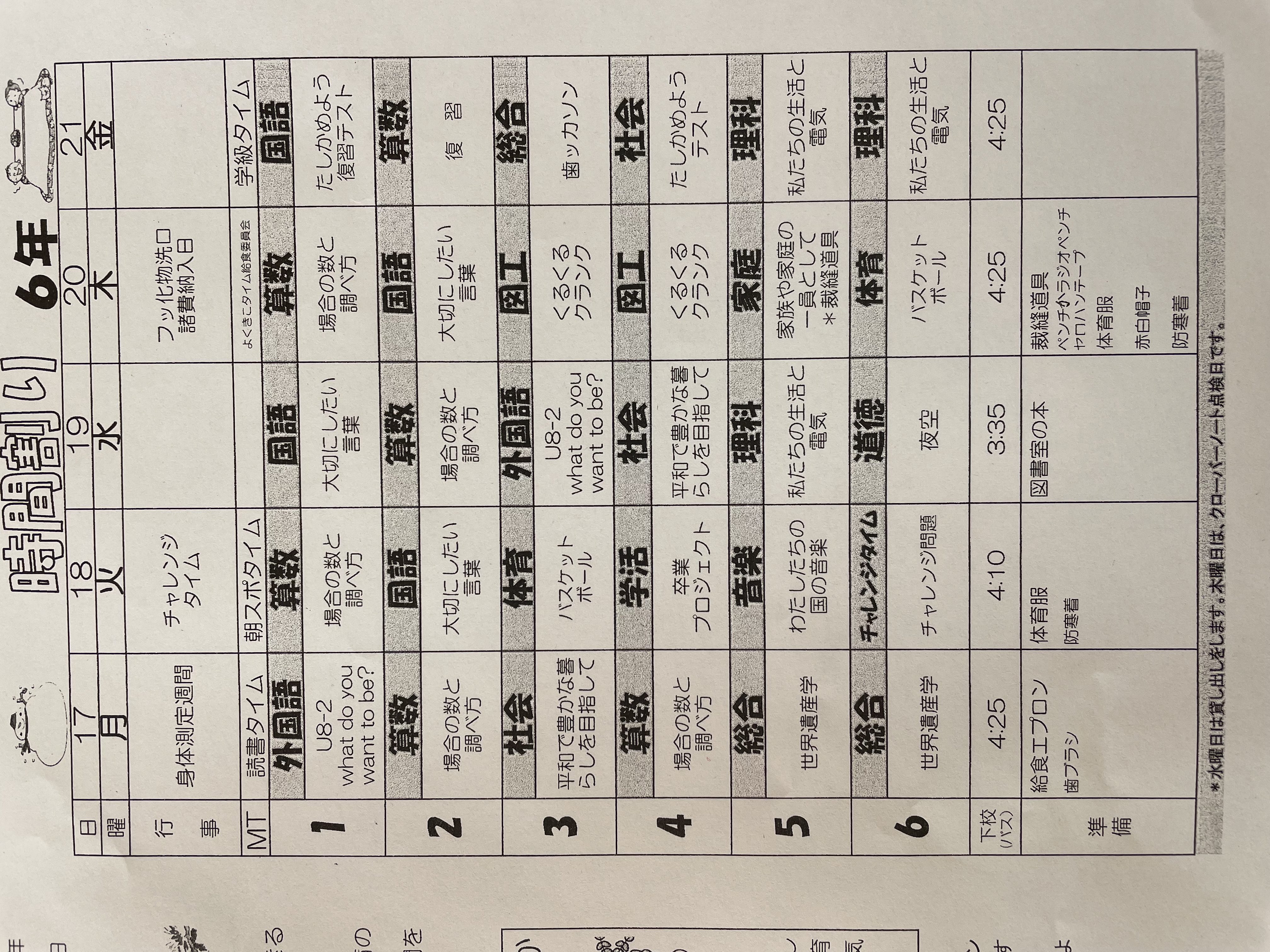 1月17日から1月21日までの時間割 投稿日時 : 2022/01/14 学校サイト管理者 1年1組.JPG 1年2組.JPG 2年1組.JPG 3年1組.JPG 4年1組.JPG 5年1組.JPG 5年2組.JPG 6年1組.JPG の1組1年.JPG の1組3年.JPG の1組5年6年.JPG の2組4年5年.JPG の3組1年.JPG の3組2年.JPG の3組3年.JPG の3組5年.JPG
