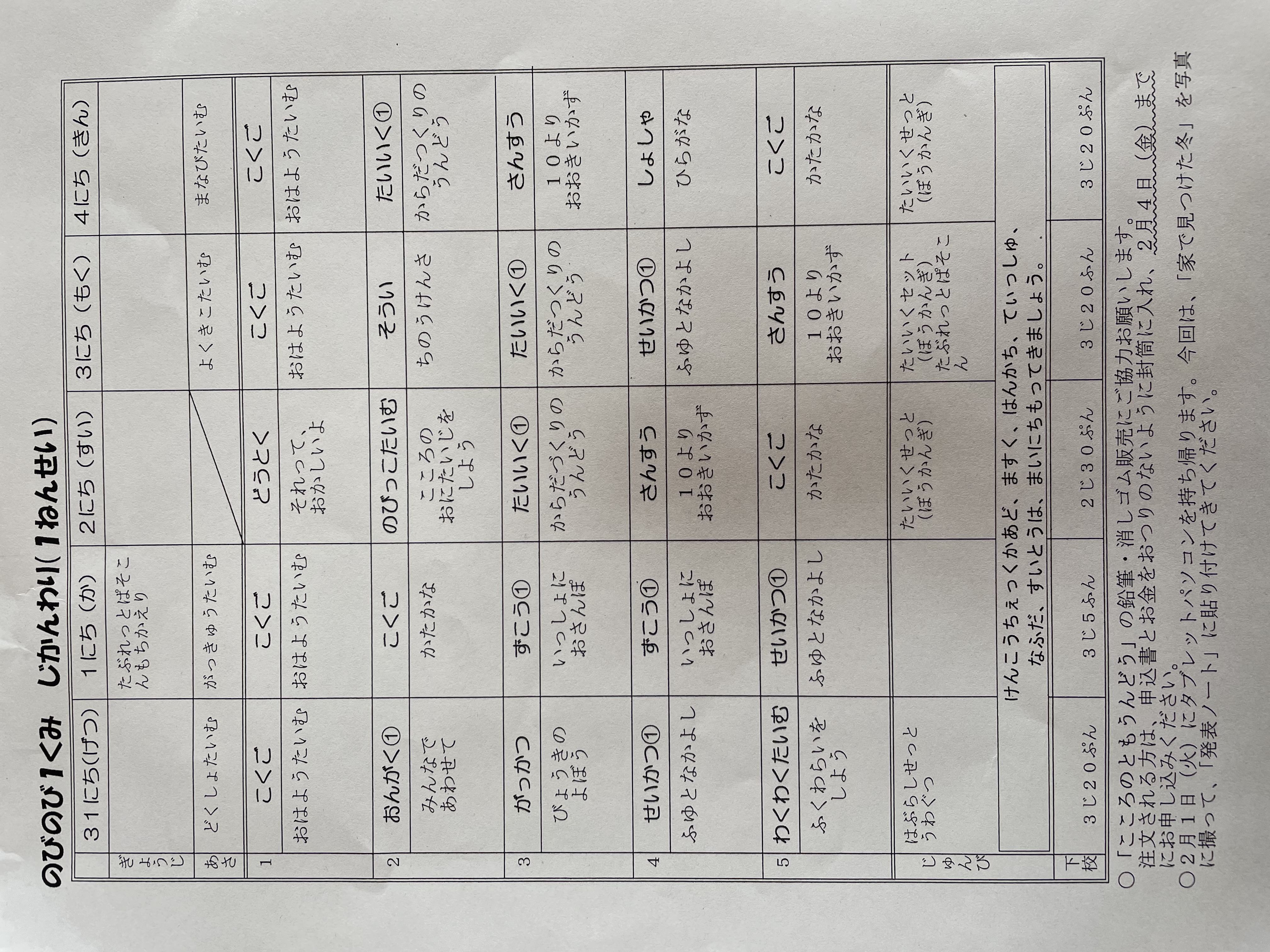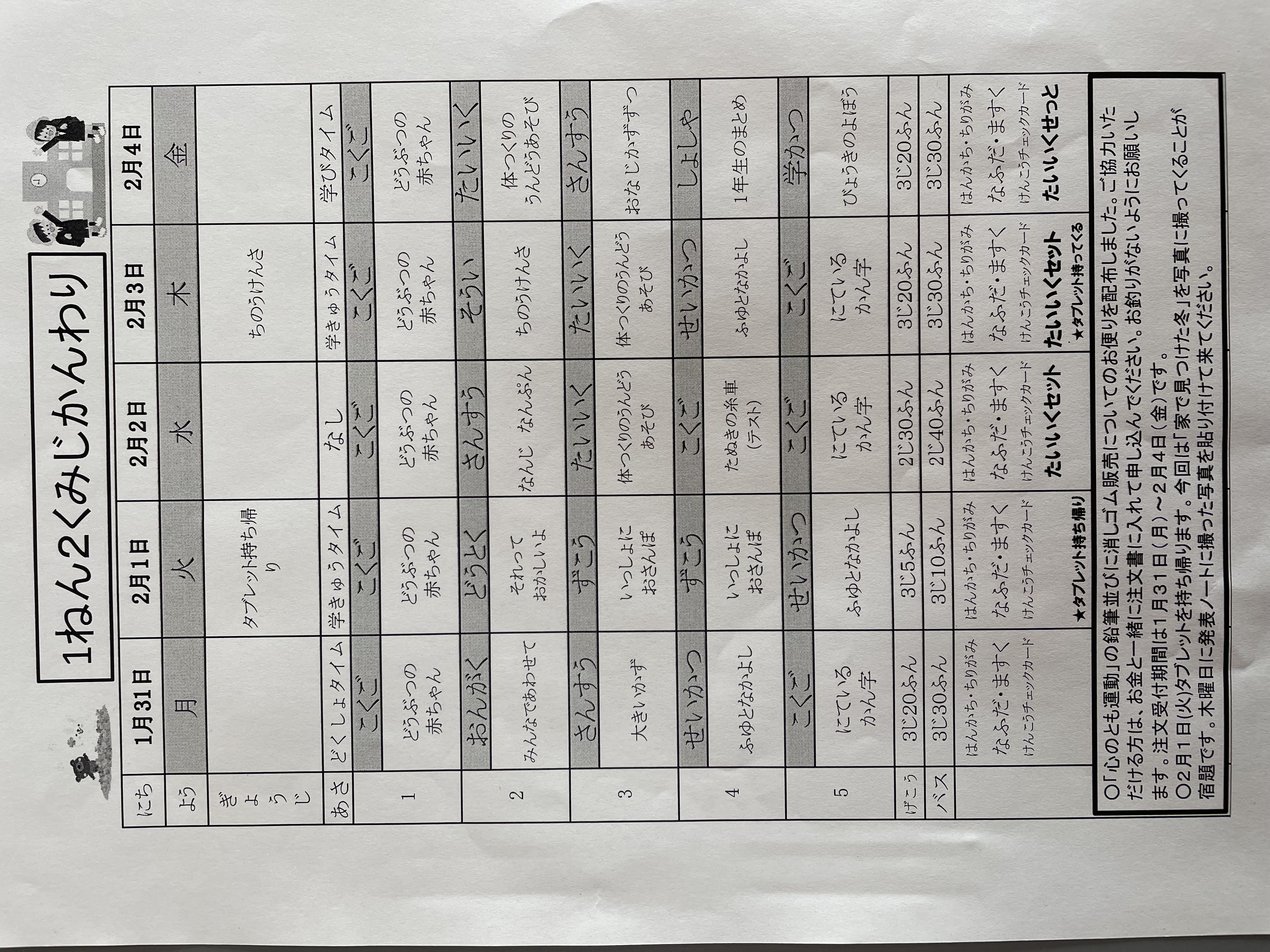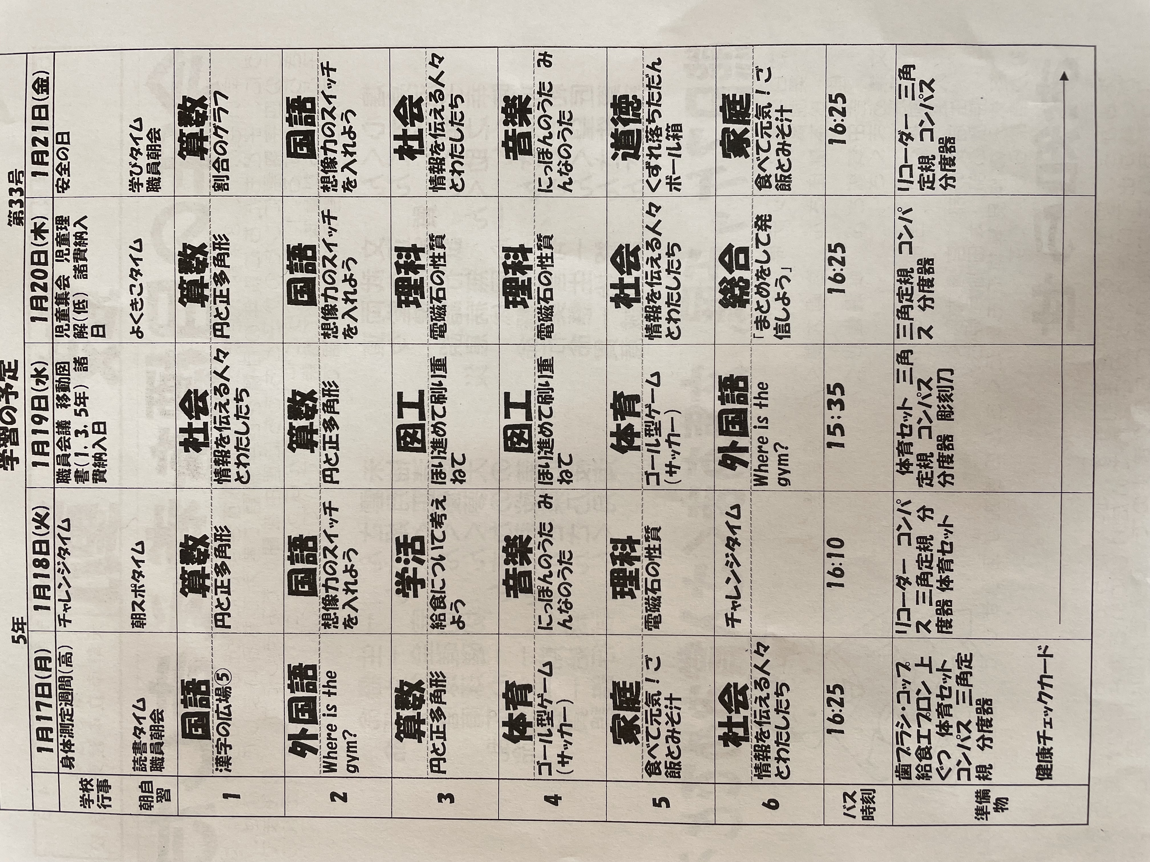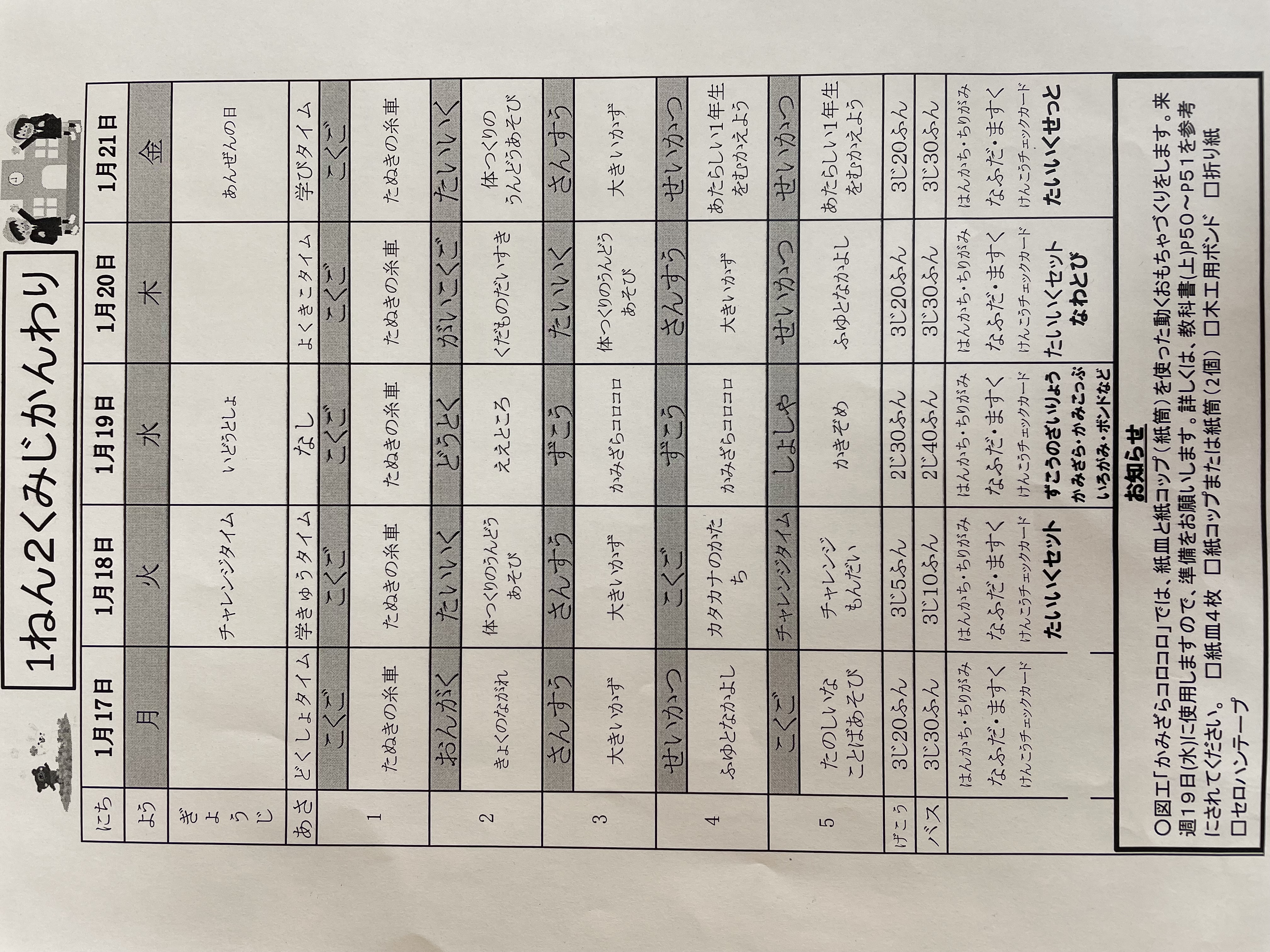 1月17日から1月21日までの時間割 投稿日時 : 2022/01/14 学校サイト管理者 1年1組.JPG 1年2組.JPG 2年1組.JPG 3年1組.JPG 4年1組.JPG 5年1組.JPG 5年2組.JPG 6年1組.JPG の1組1年.JPG の1組3年.JPG の1組5年6年.JPG の2組4年5年.JPG の3組1年.JPG の3組2年.JPG の3組3年.JPG の3組5年.JPG