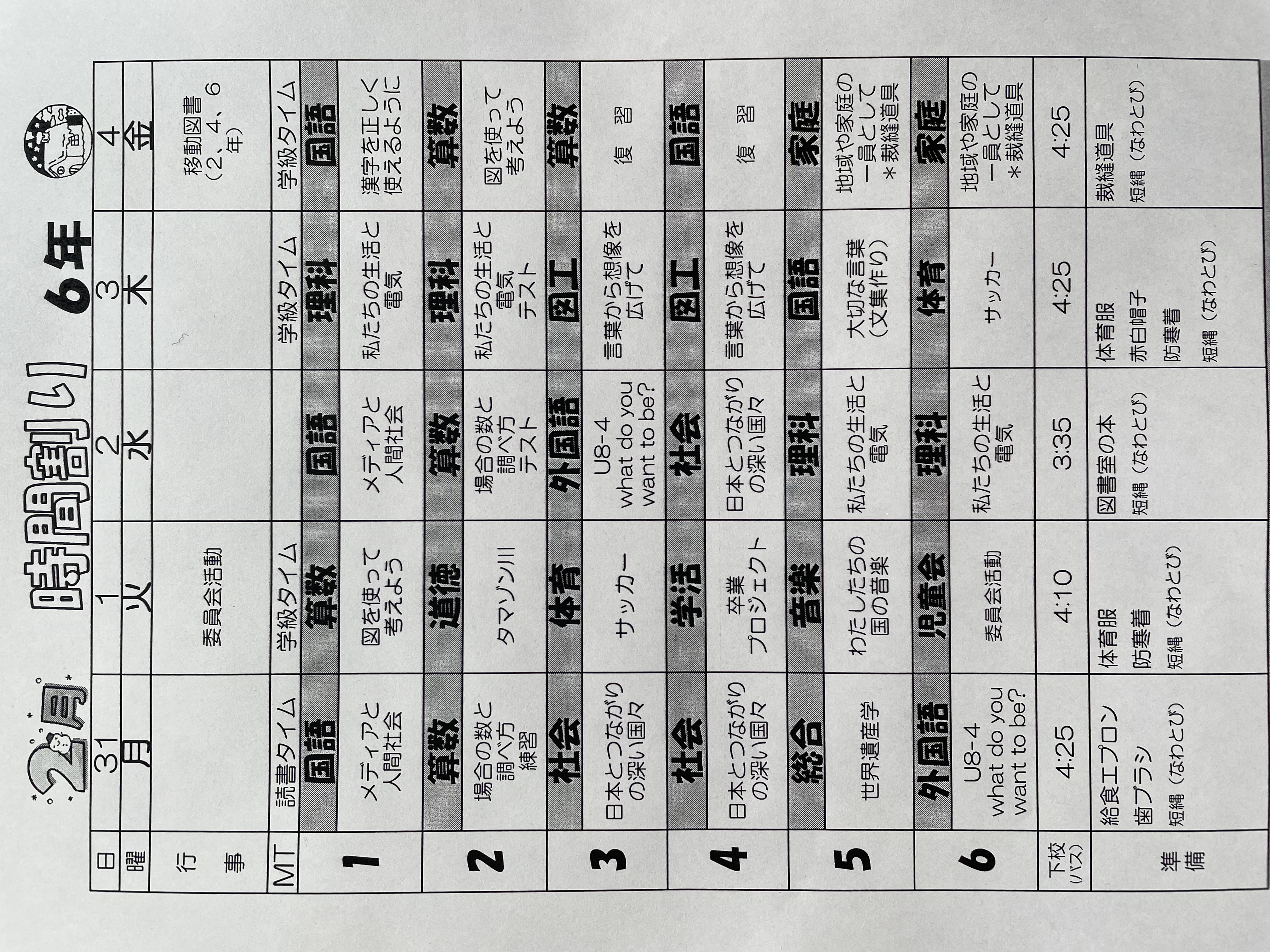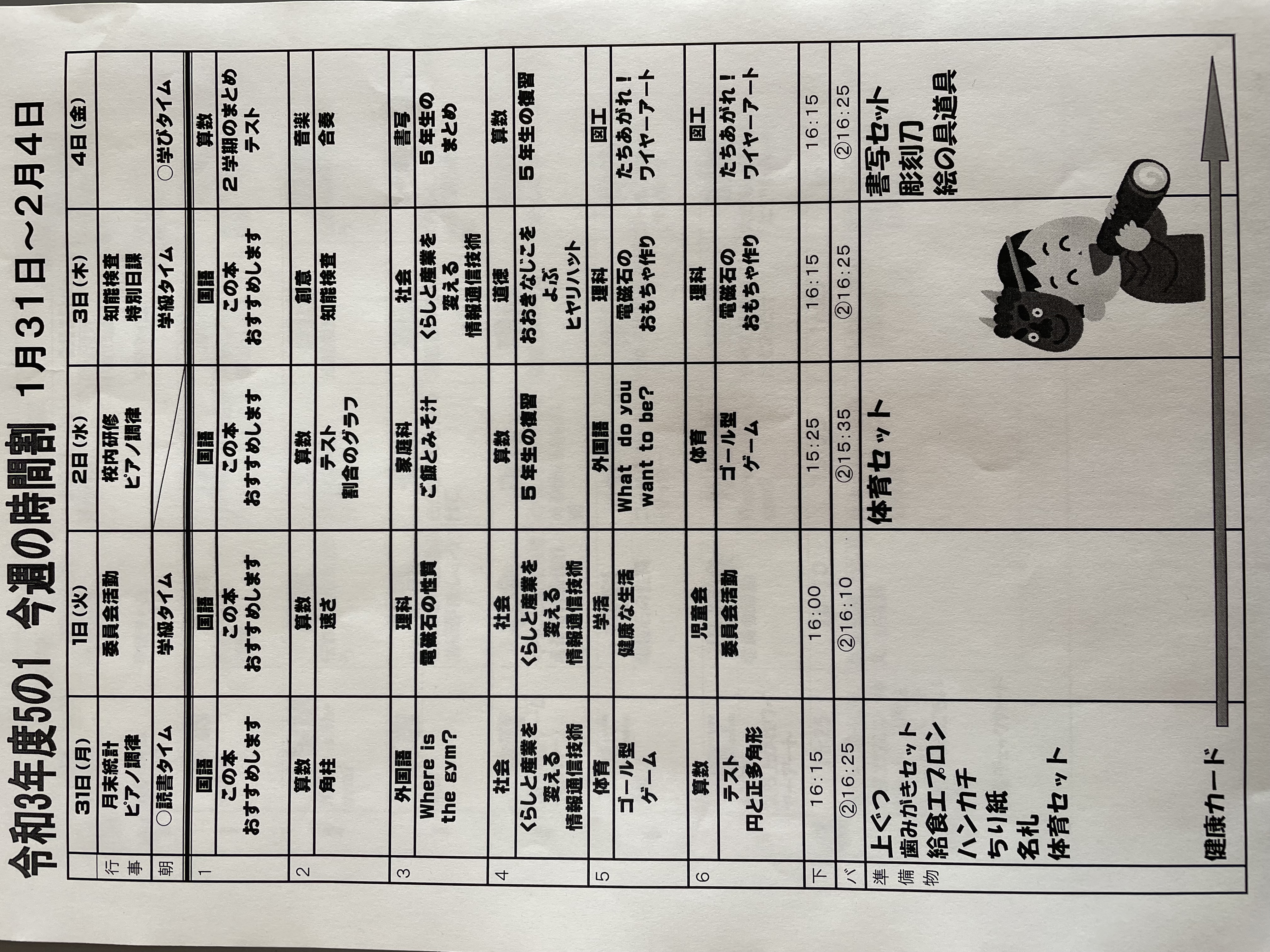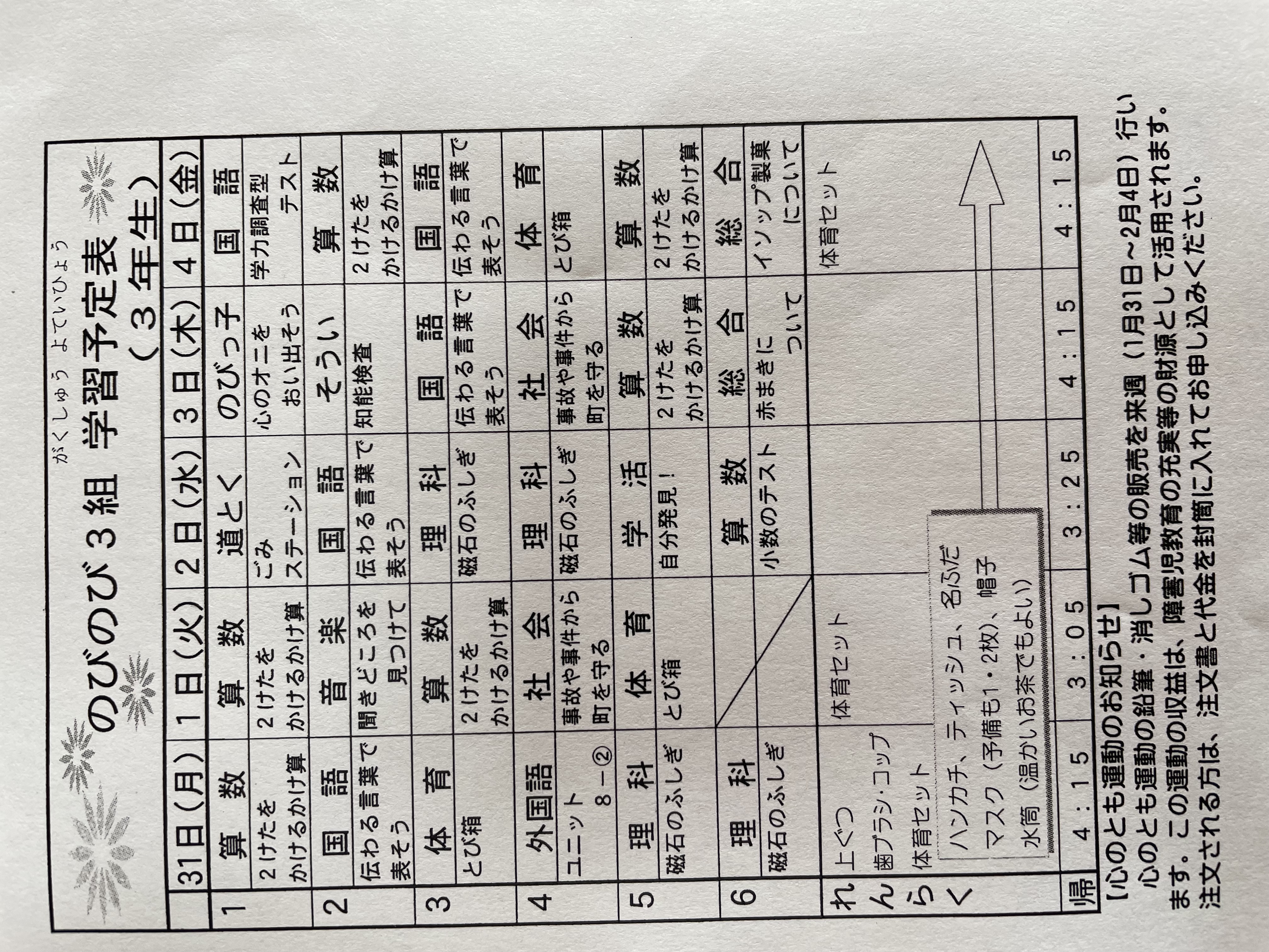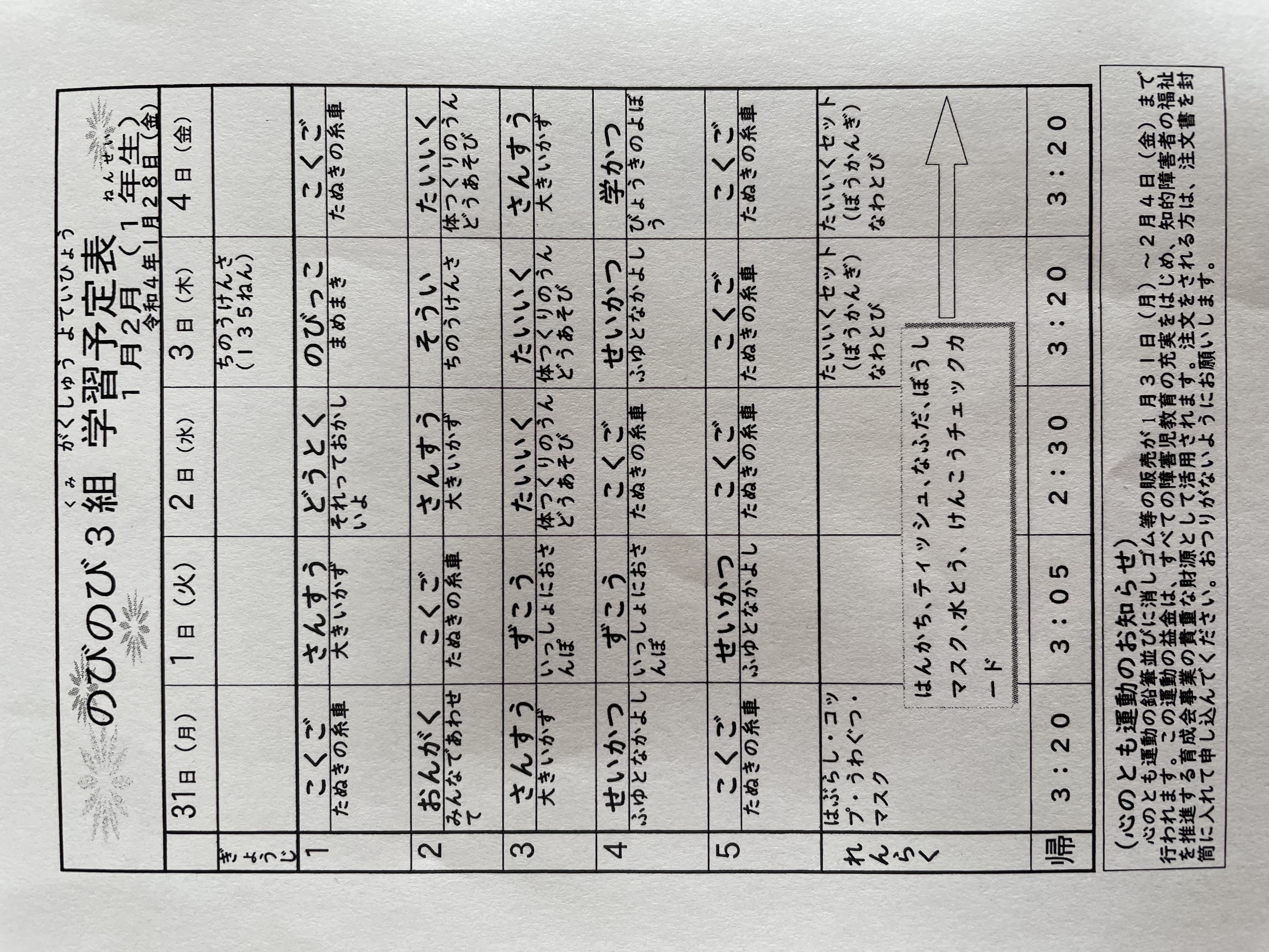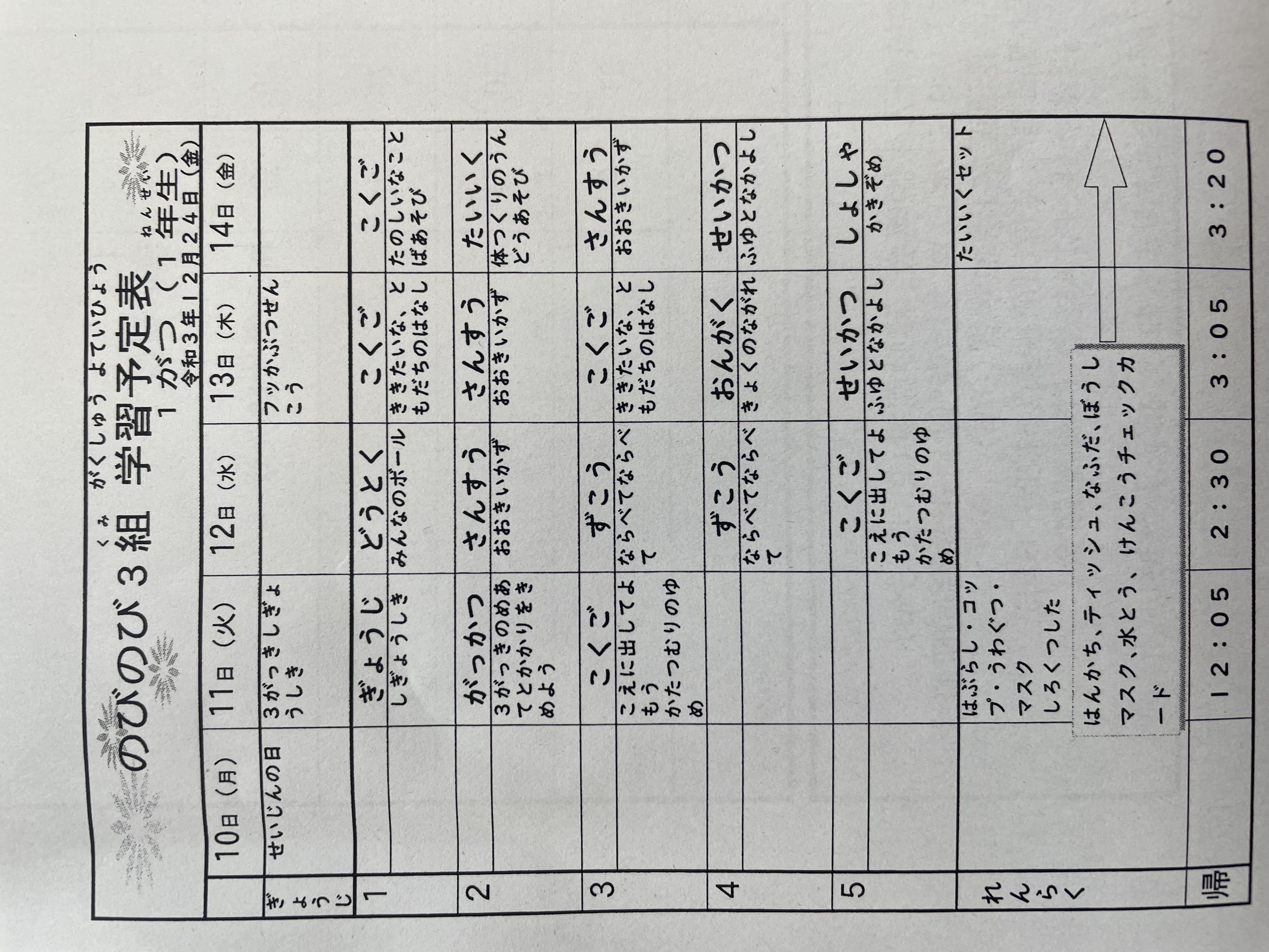 1月17日から1月21日までの時間割 投稿日時 : 2022/01/14 学校サイト管理者 1年1組.JPG 1年2組.JPG 2年1組.JPG 3年1組.JPG 4年1組.JPG 5年1組.JPG 5年2組.JPG 6年1組.JPG の1組1年.JPG の1組3年.JPG の1組5年6年.JPG の2組4年5年.JPG の3組1年.JPG の3組2年.JPG の3組3年.JPG の3組5年.JPG