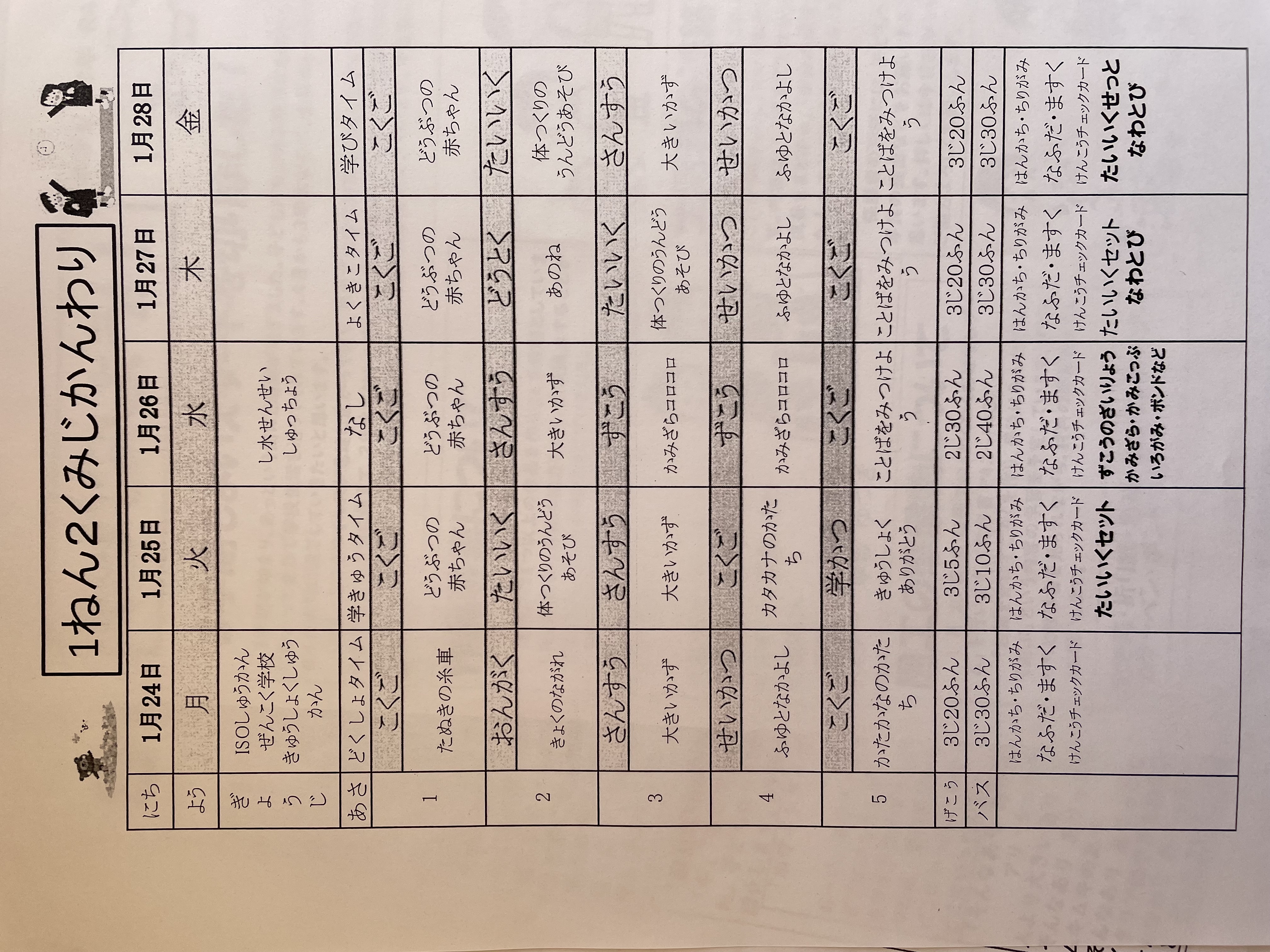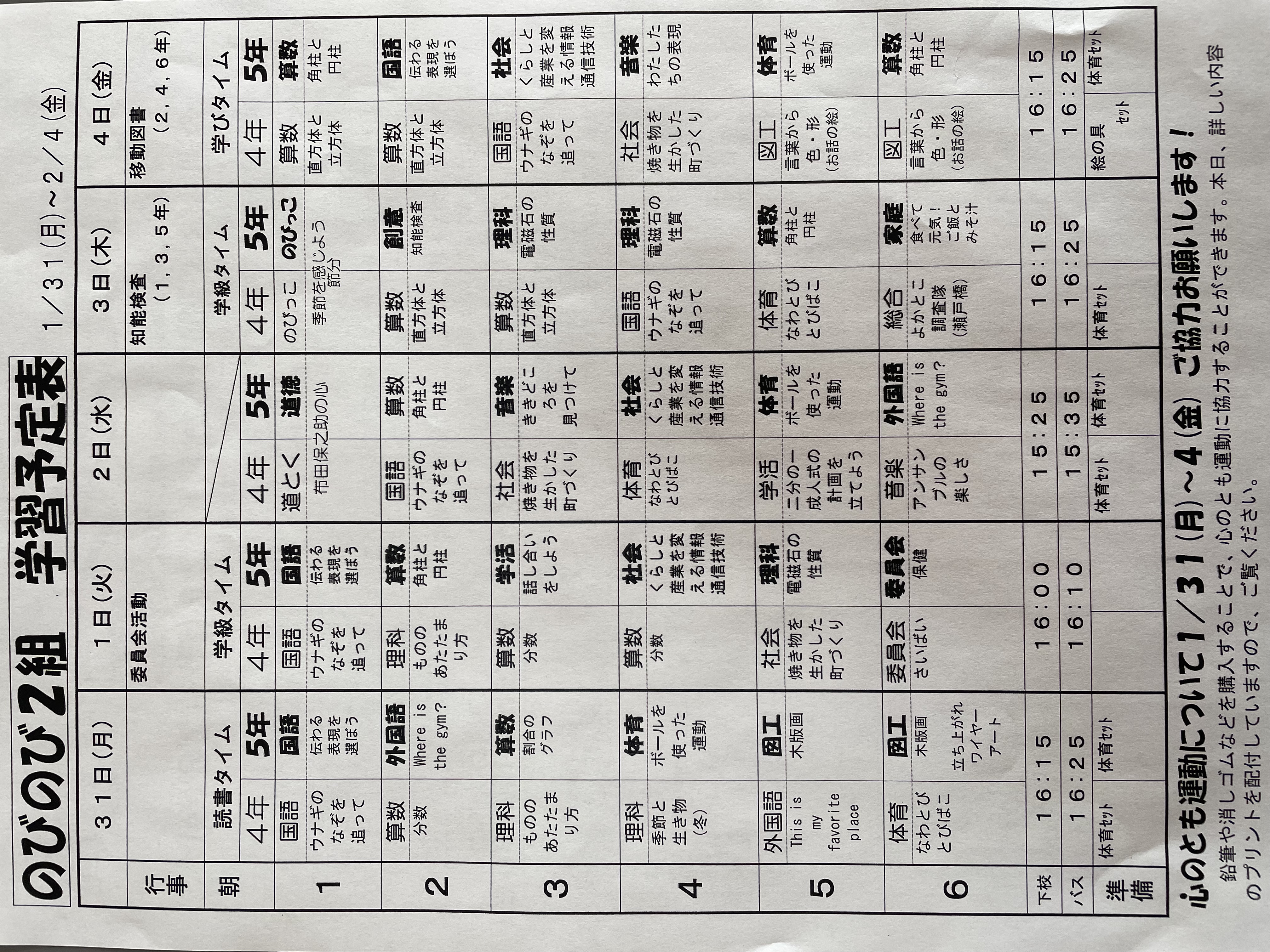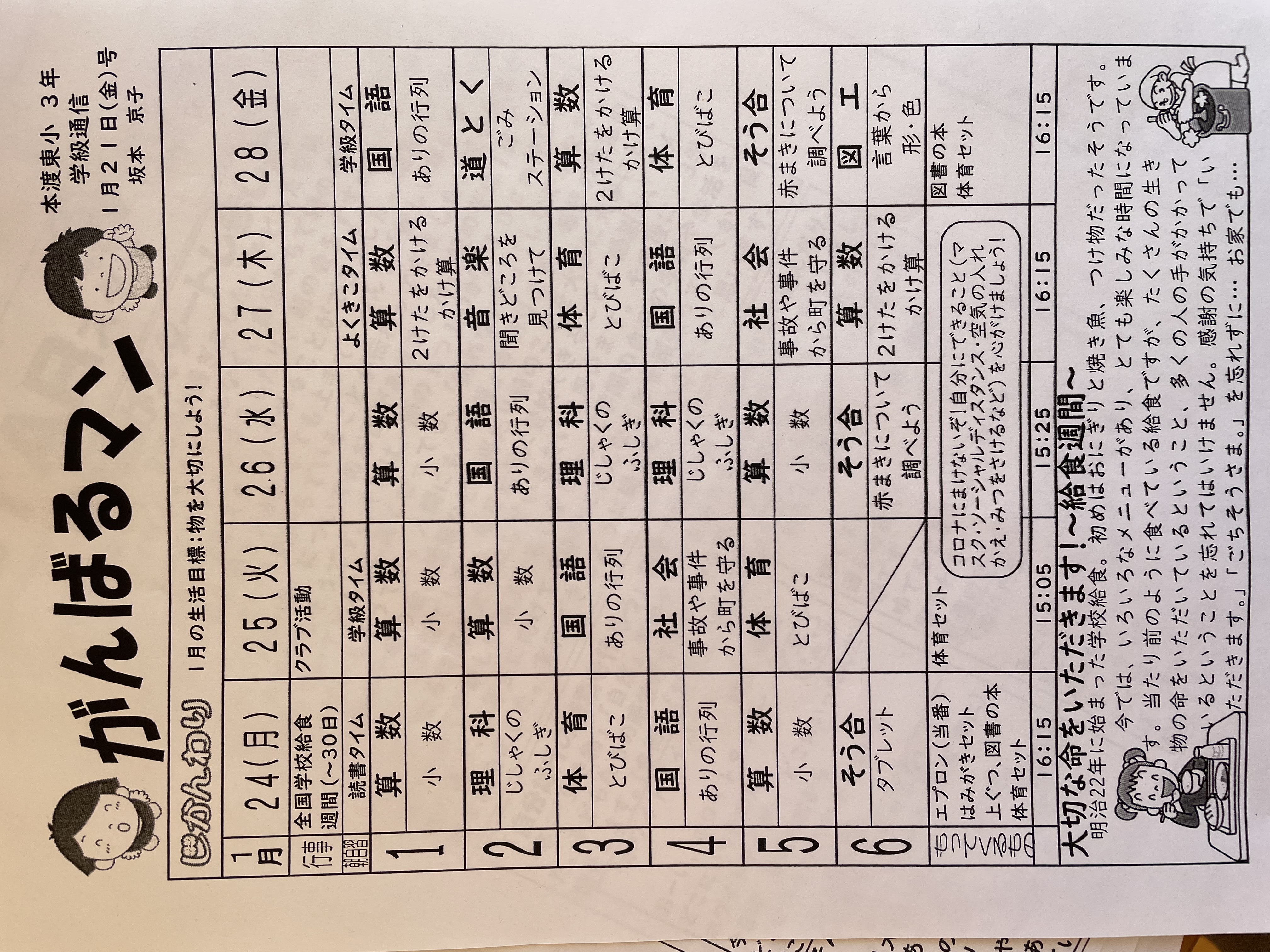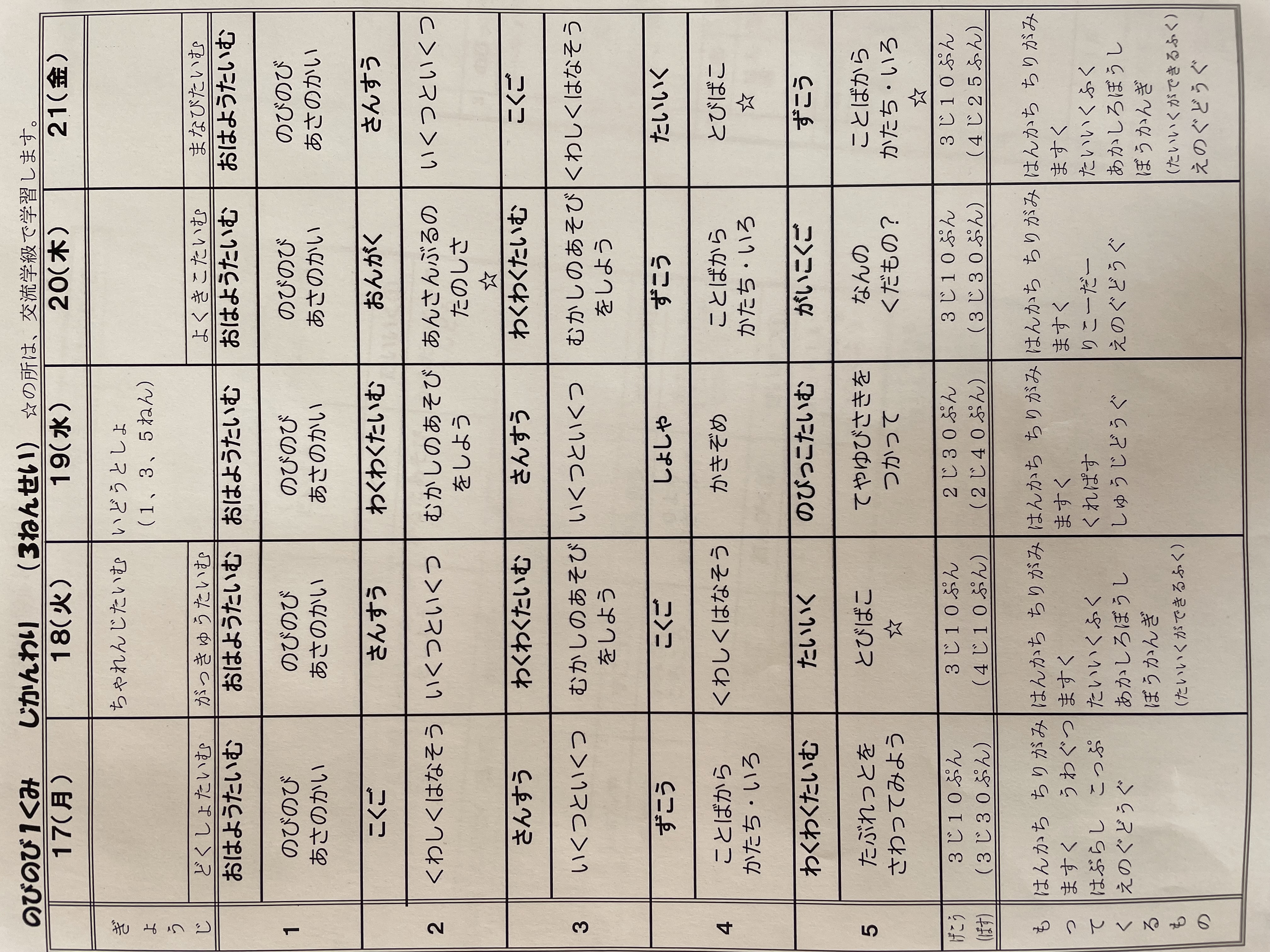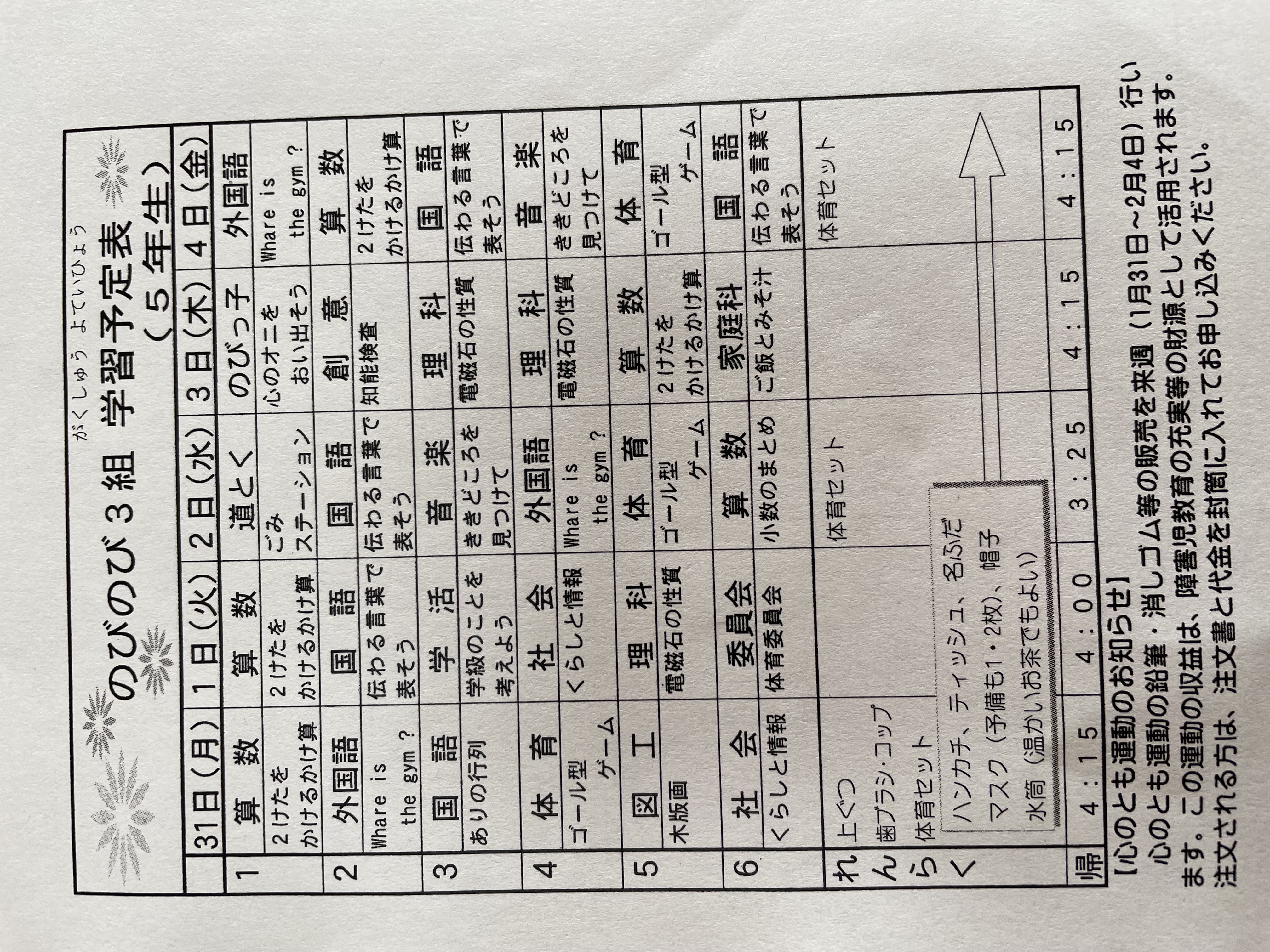 1月17日から1月21日までの時間割 投稿日時 : 2022/01/14 学校サイト管理者 1年1組.JPG 1年2組.JPG 2年1組.JPG 3年1組.JPG 4年1組.JPG 5年1組.JPG 5年2組.JPG 6年1組.JPG の1組1年.JPG の1組3年.JPG の1組5年6年.JPG の2組4年5年.JPG の3組1年.JPG の3組2年.JPG の3組3年.JPG の3組5年.JPG