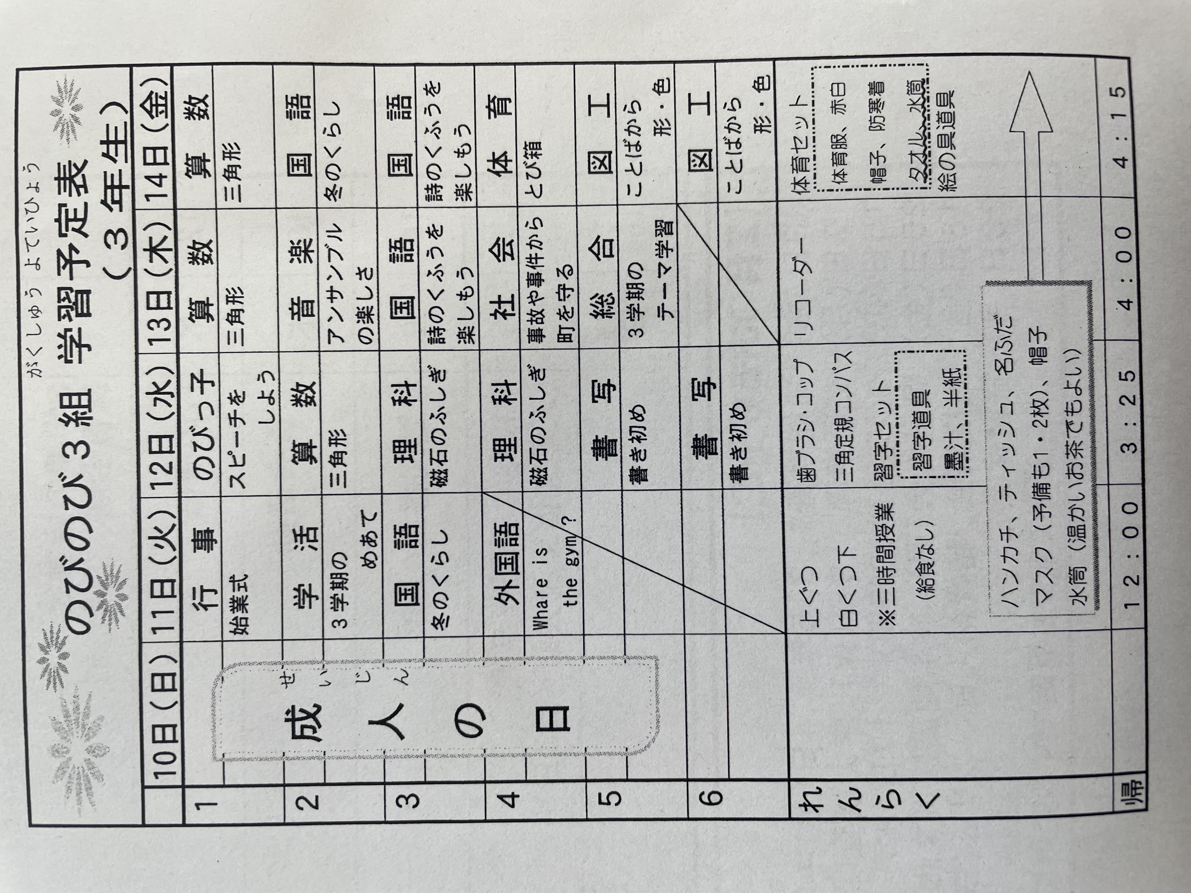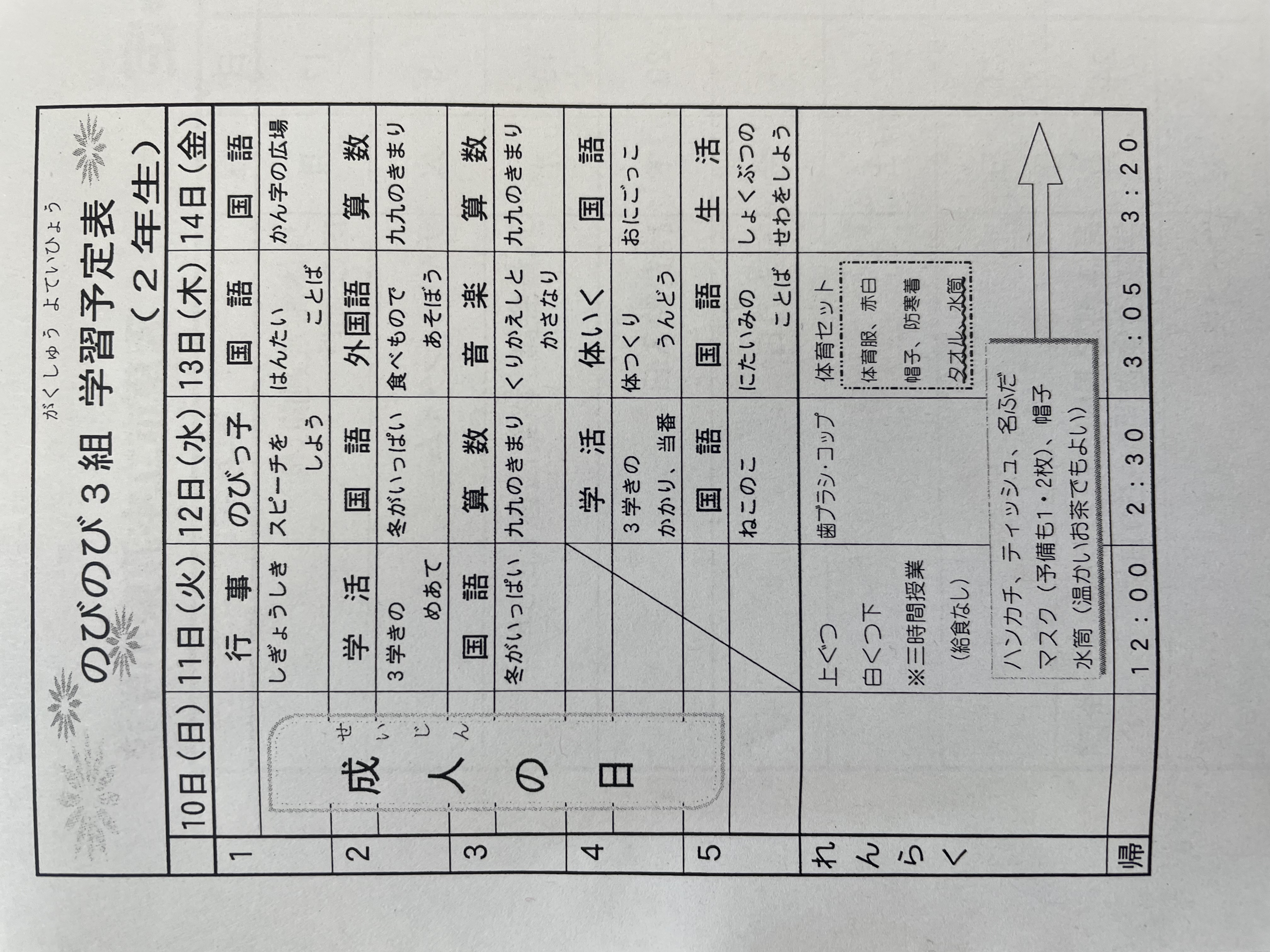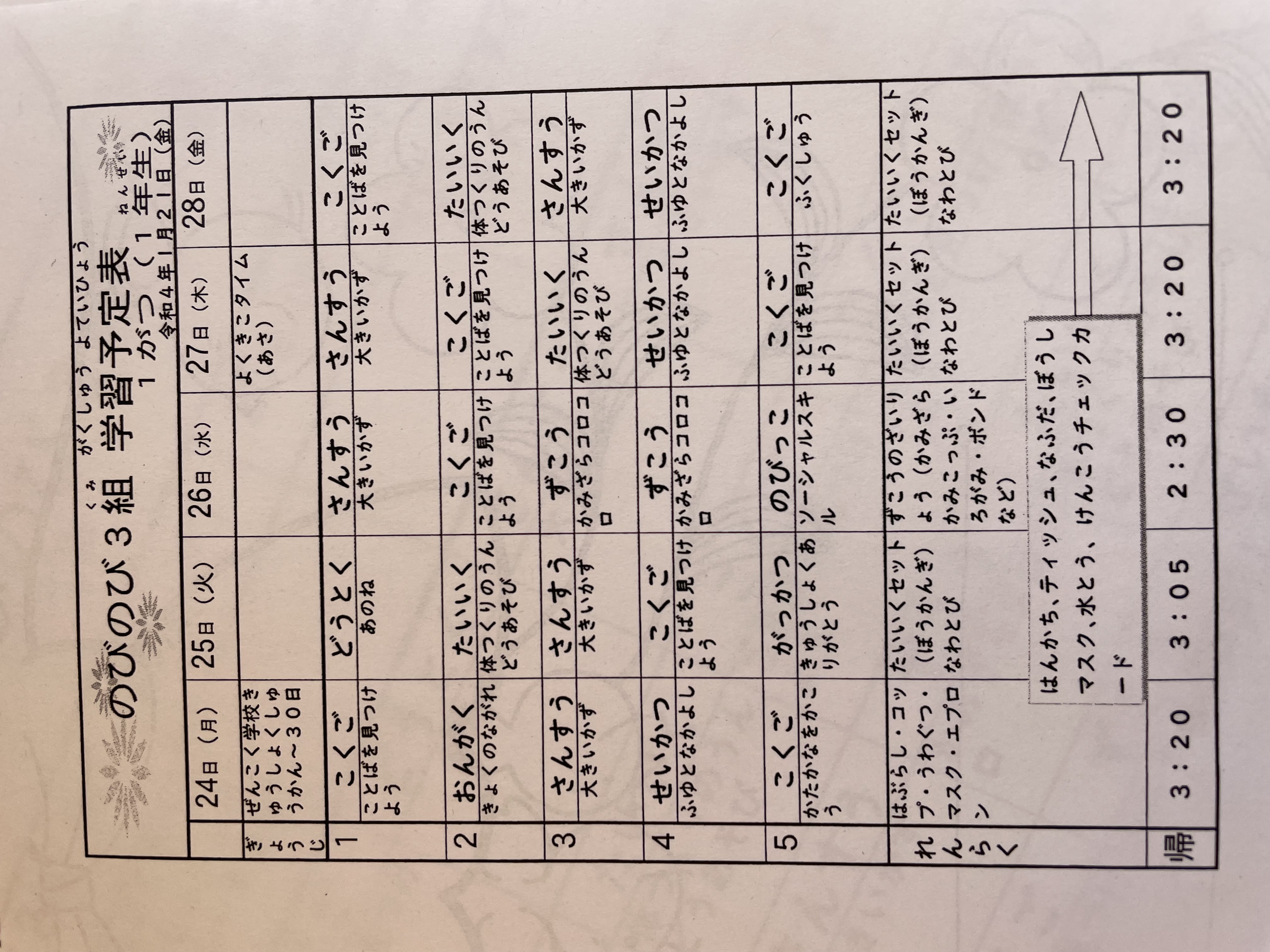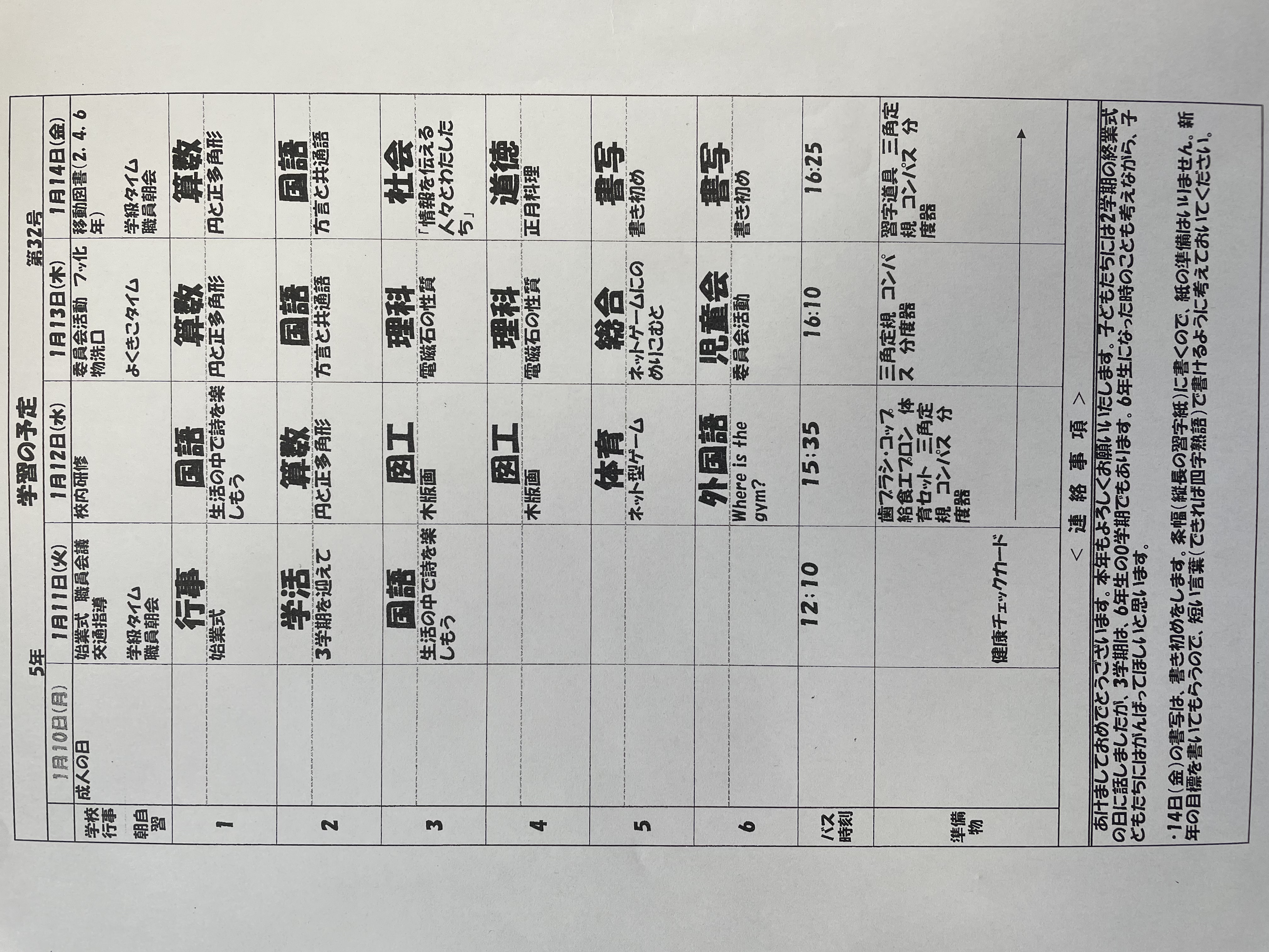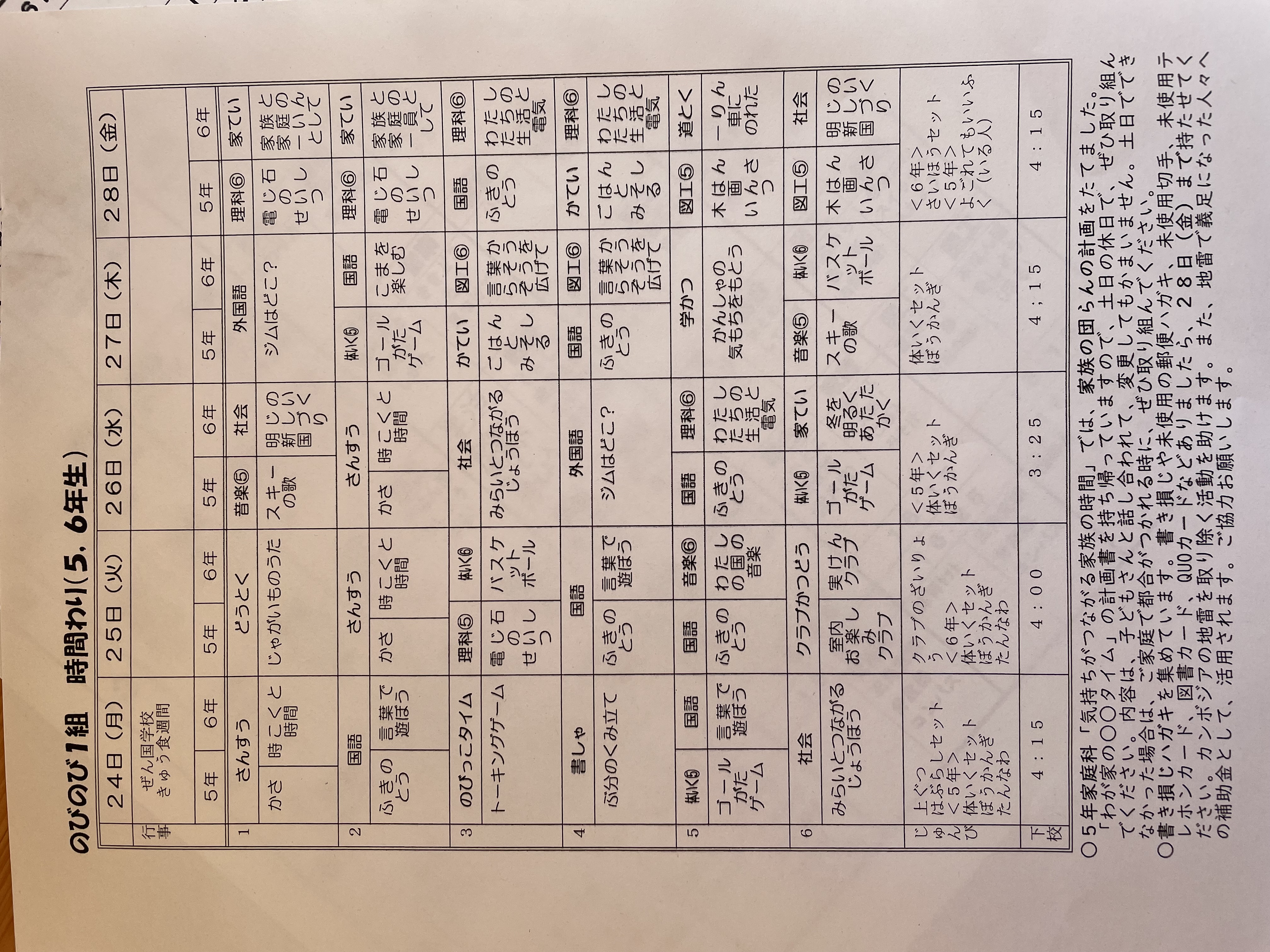 1月17日から1月21日までの時間割 投稿日時 : 2022/01/14 学校サイト管理者 1年1組.JPG 1年2組.JPG 2年1組.JPG 3年1組.JPG 4年1組.JPG 5年1組.JPG 5年2組.JPG 6年1組.JPG の1組1年.JPG の1組3年.JPG の1組5年6年.JPG の2組4年5年.JPG の3組1年.JPG の3組2年.JPG の3組3年.JPG の3組5年.JPG