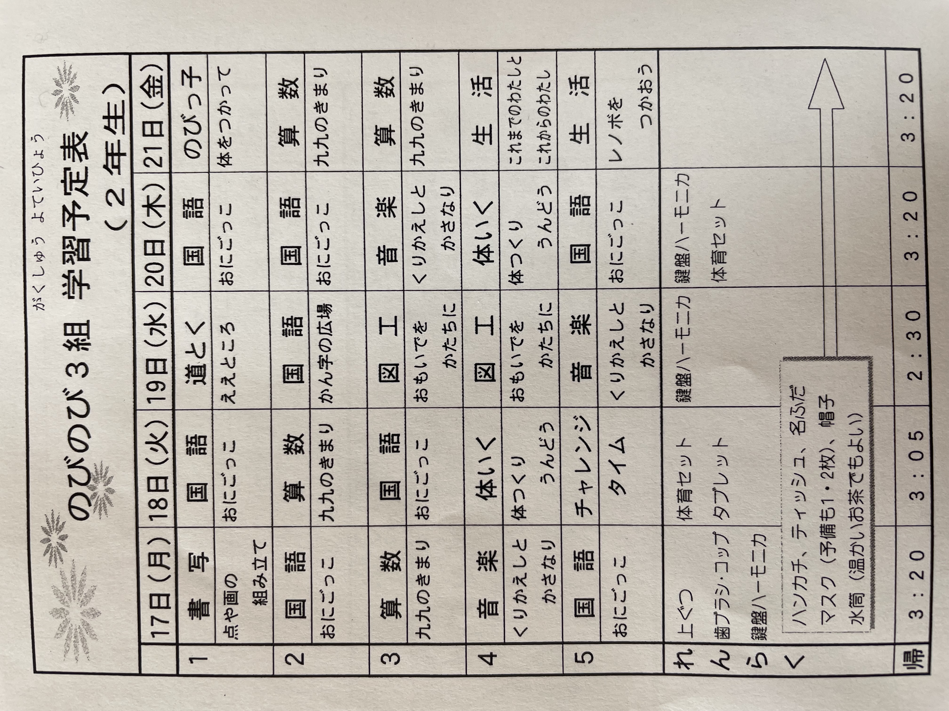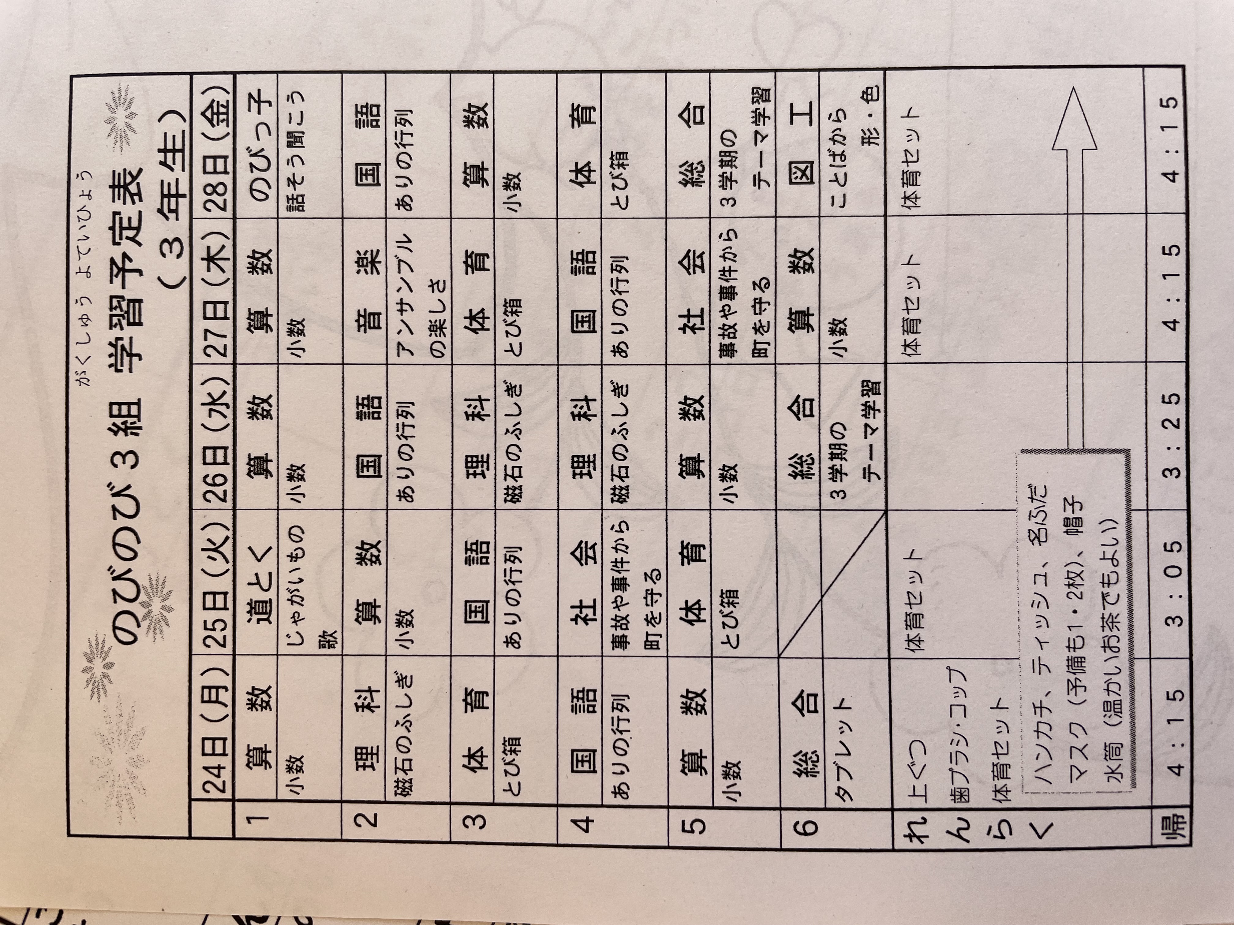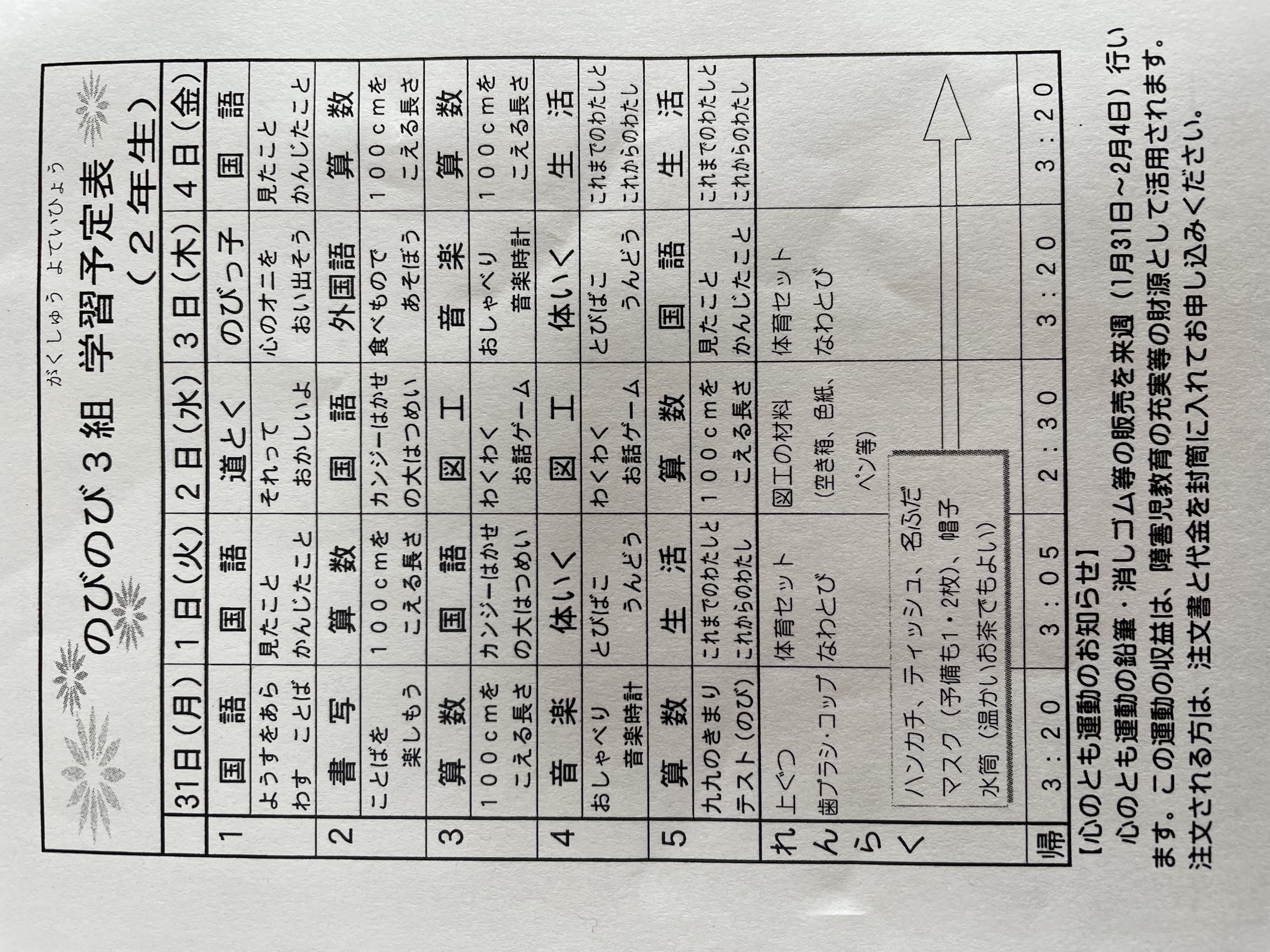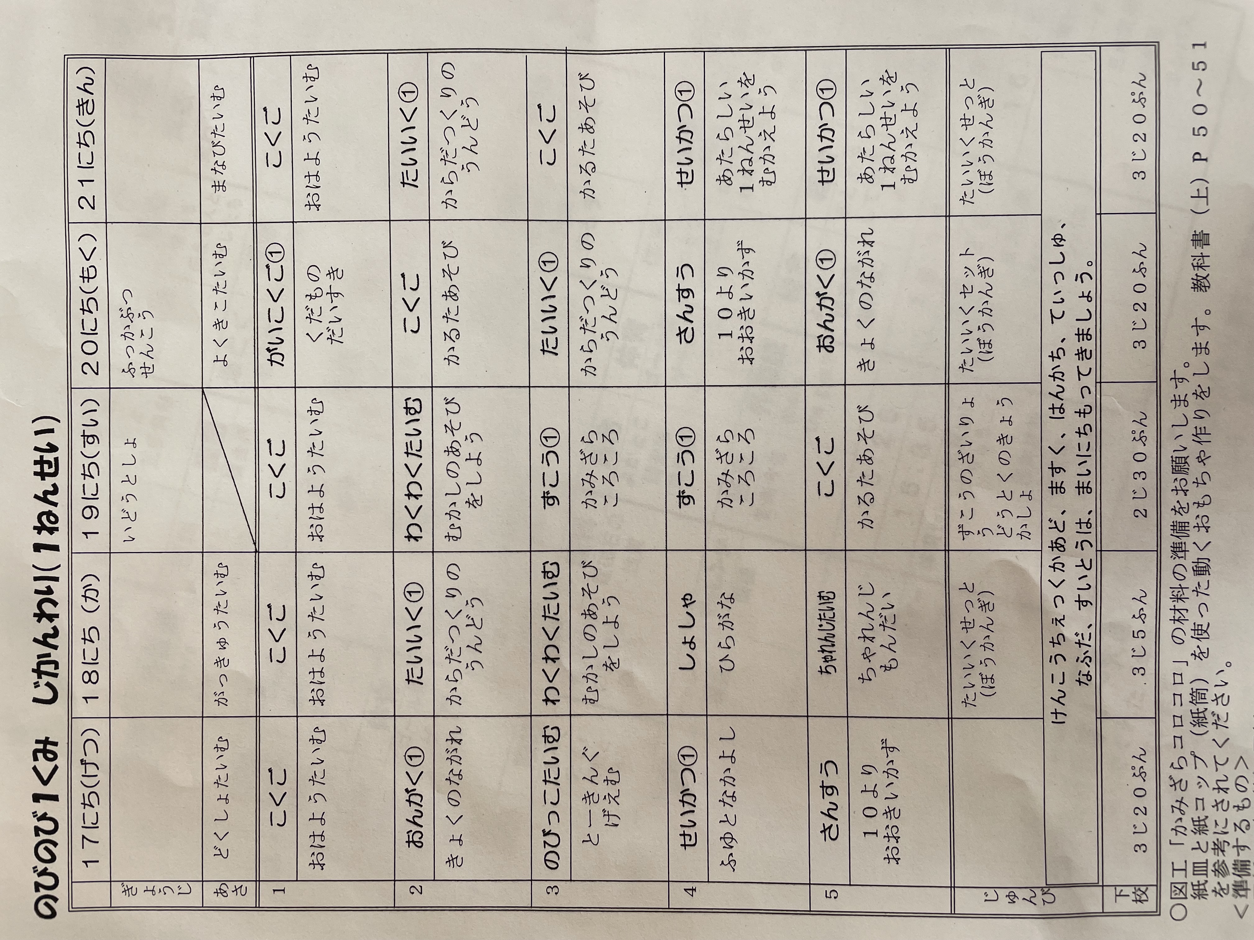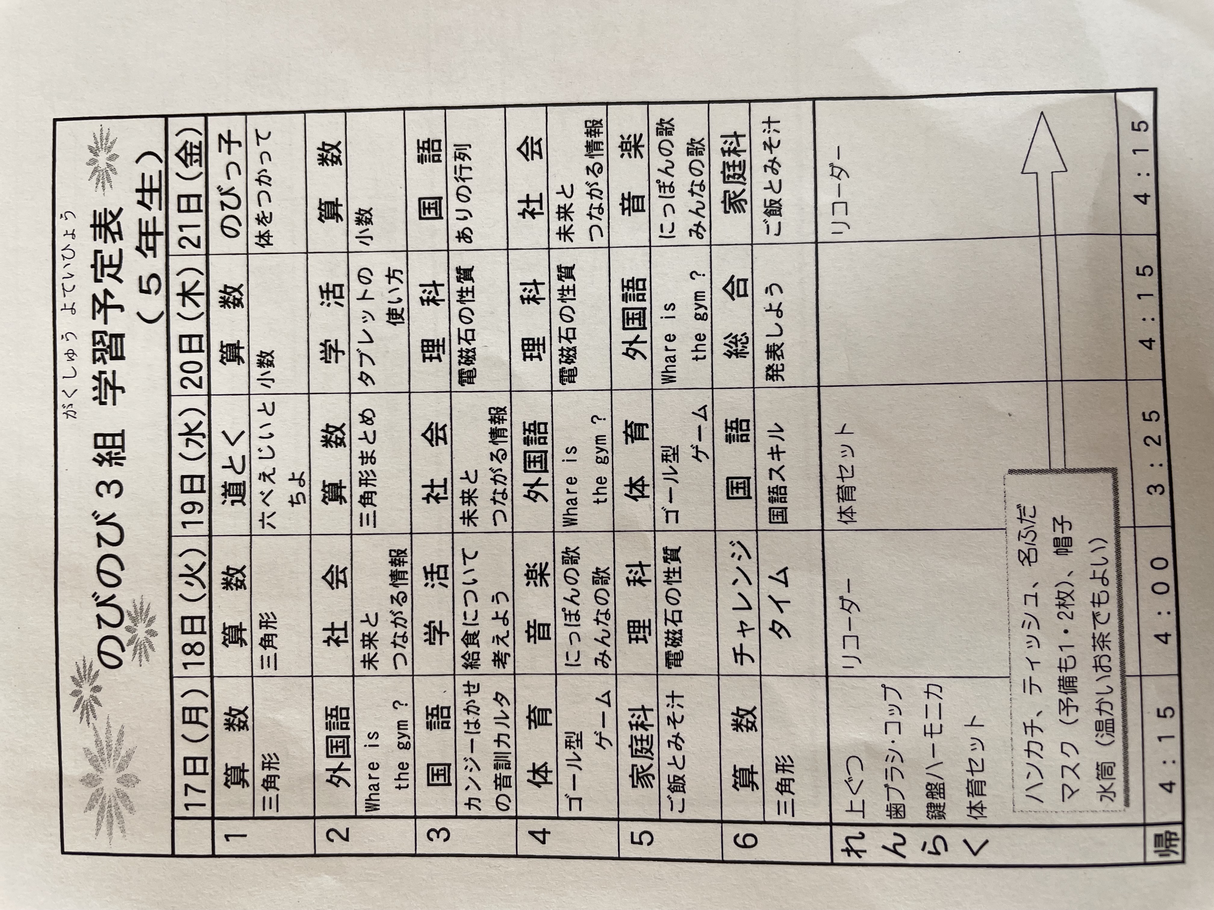 1月17日から1月21日までの時間割 投稿日時 : 2022/01/14 学校サイト管理者 1年1組.JPG 1年2組.JPG 2年1組.JPG 3年1組.JPG 4年1組.JPG 5年1組.JPG 5年2組.JPG 6年1組.JPG の1組1年.JPG の1組3年.JPG の1組5年6年.JPG の2組4年5年.JPG の3組1年.JPG の3組2年.JPG の3組3年.JPG の3組5年.JPG