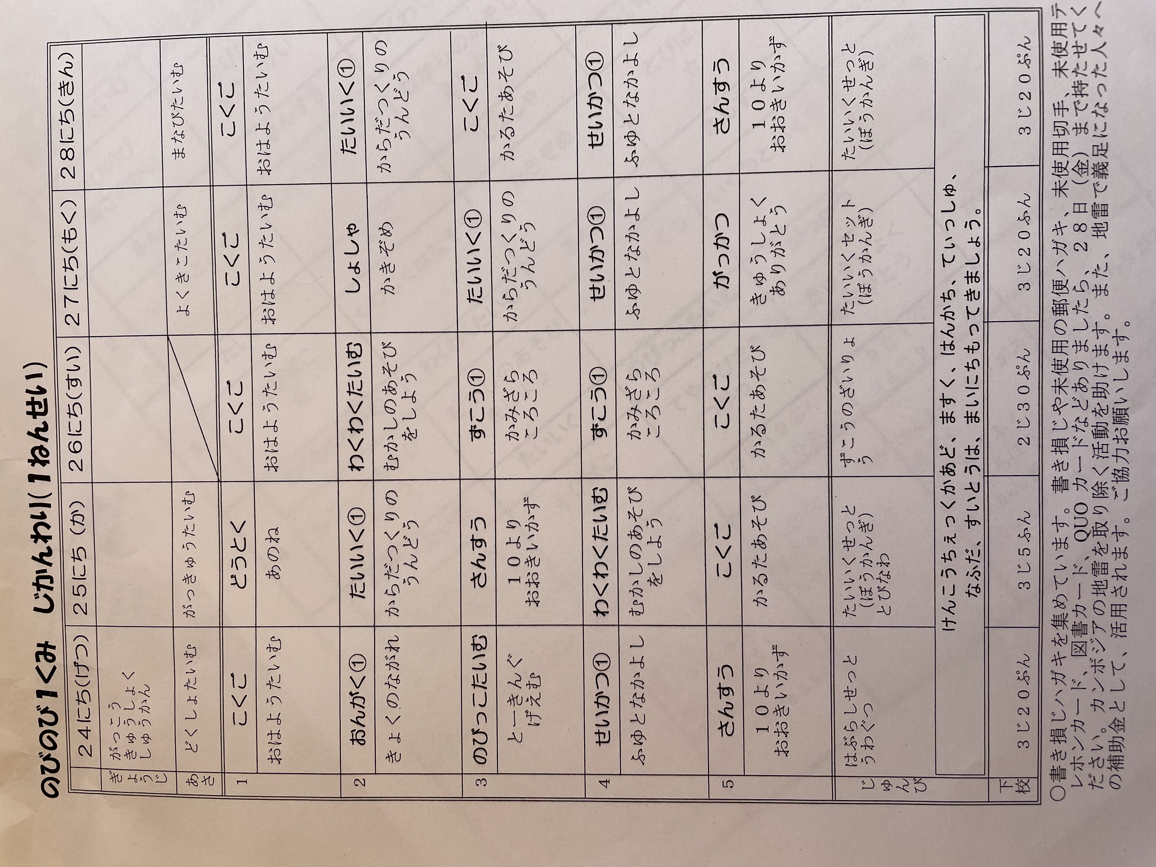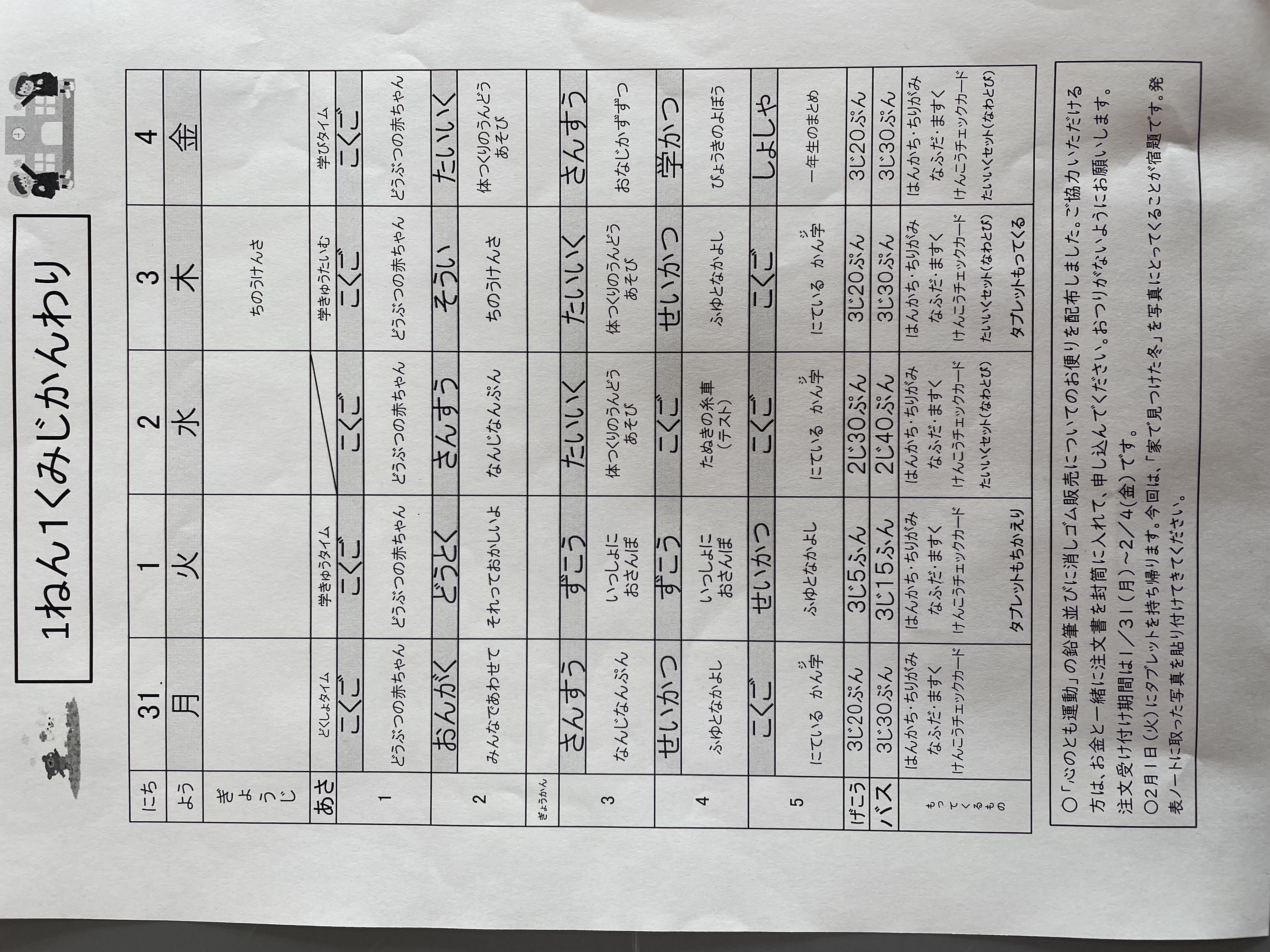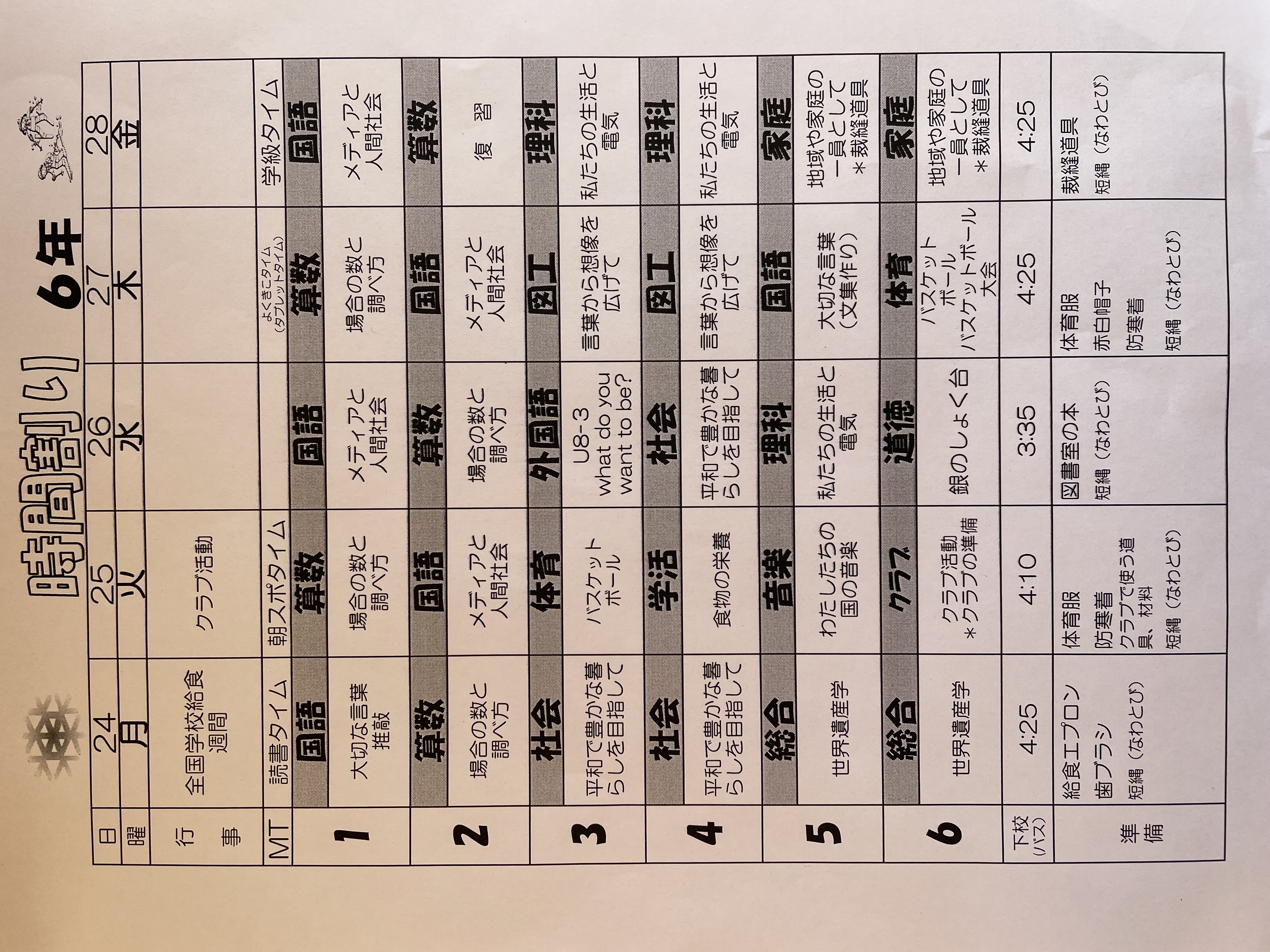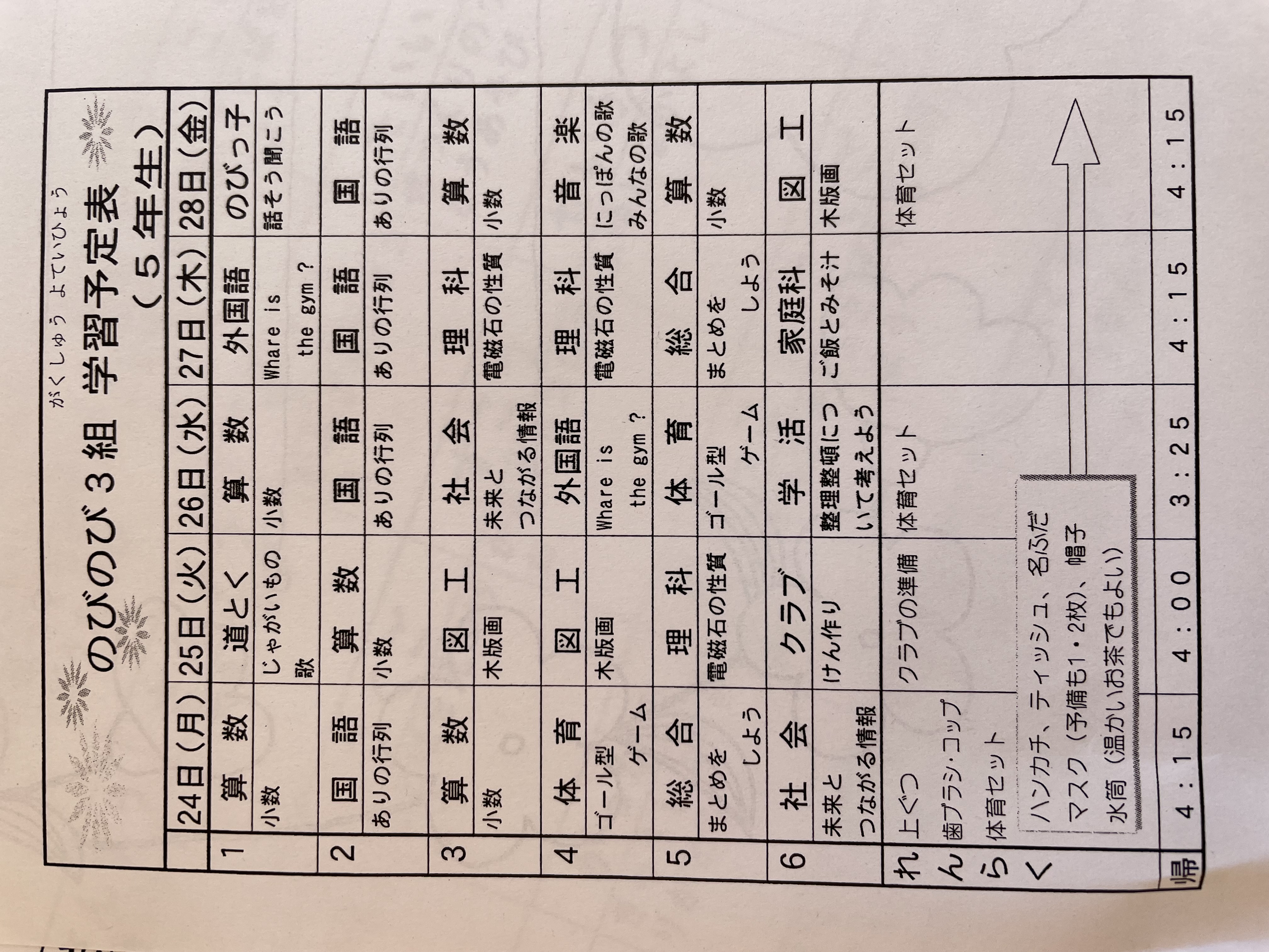 1月17日から1月21日までの時間割 投稿日時 : 2022/01/14 学校サイト管理者 1年1組.JPG 1年2組.JPG 2年1組.JPG 3年1組.JPG 4年1組.JPG 5年1組.JPG 5年2組.JPG 6年1組.JPG の1組1年.JPG の1組3年.JPG の1組5年6年.JPG の2組4年5年.JPG の3組1年.JPG の3組2年.JPG の3組3年.JPG の3組5年.JPG