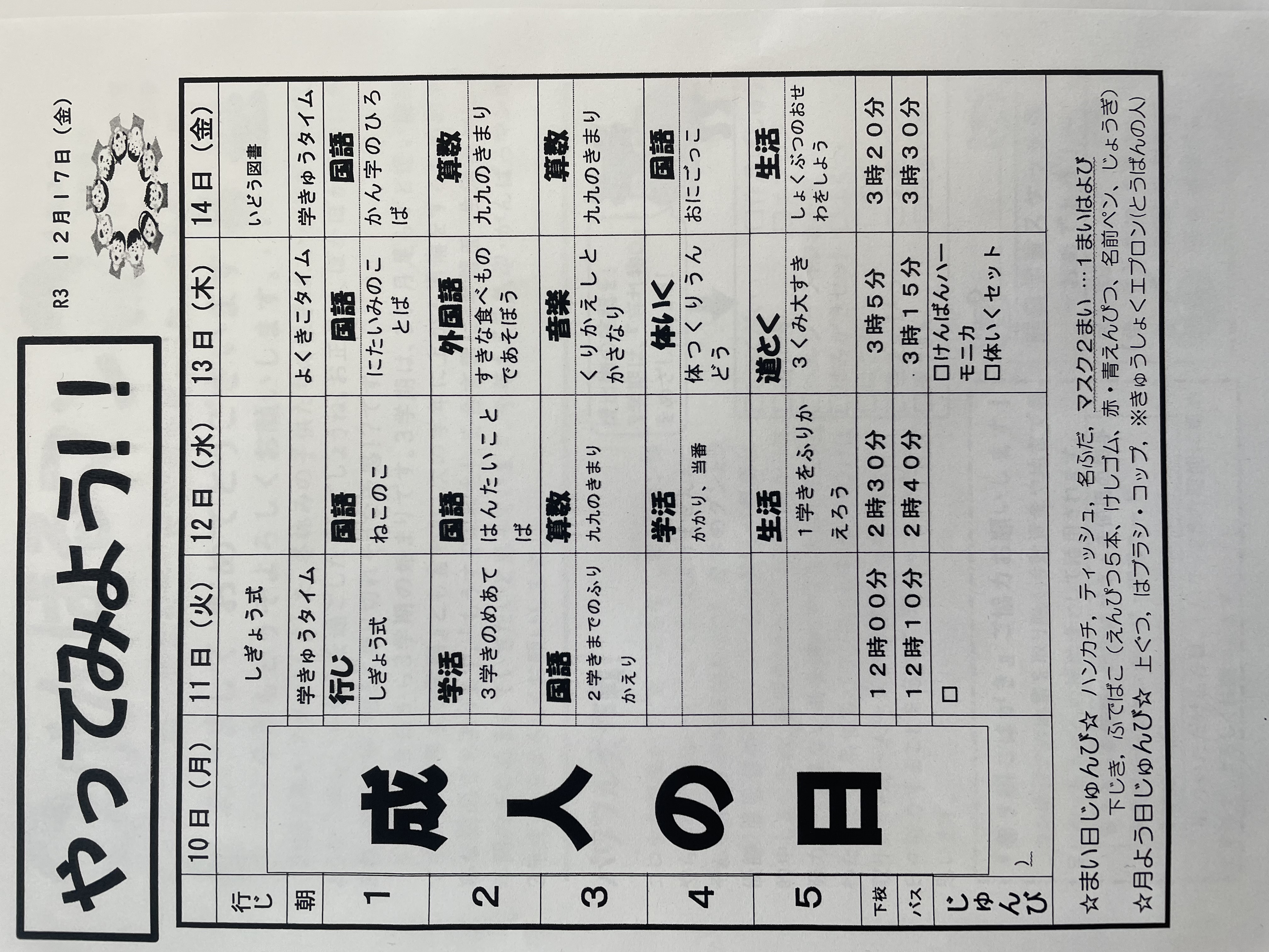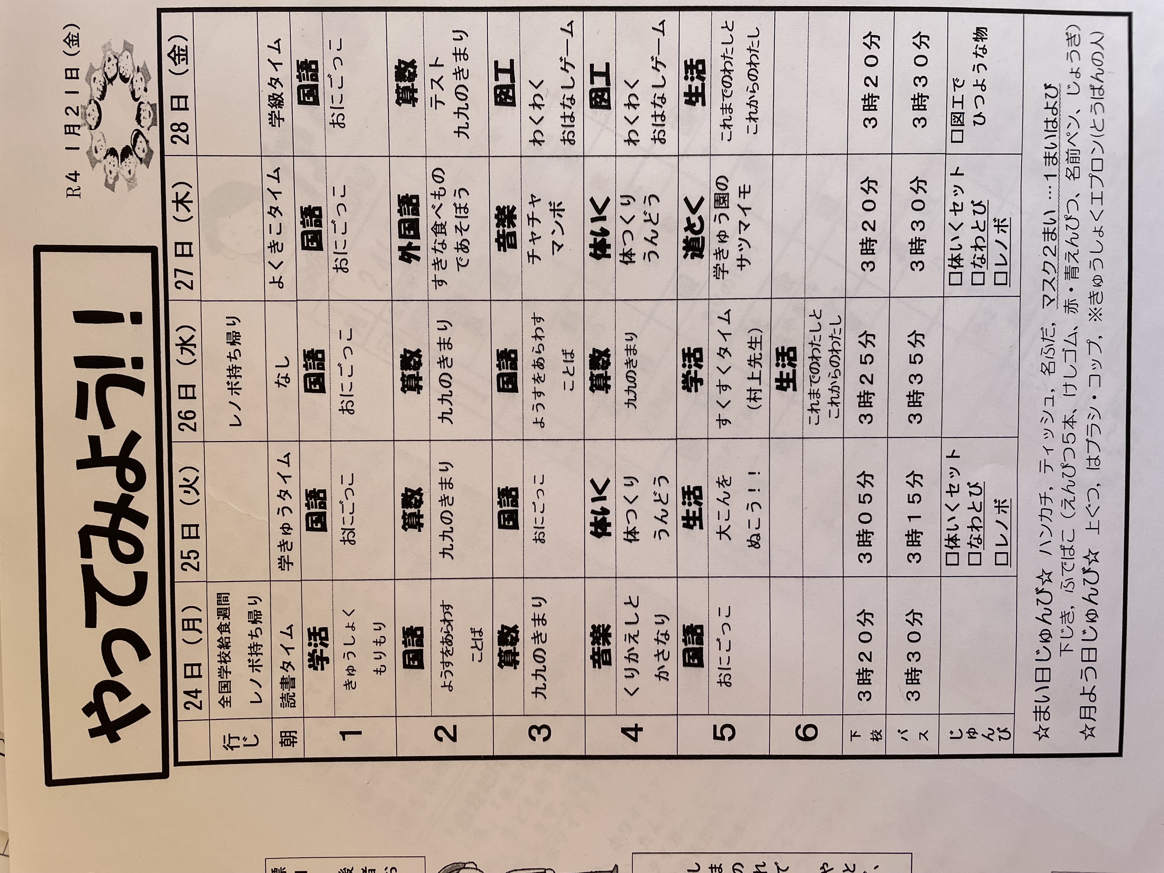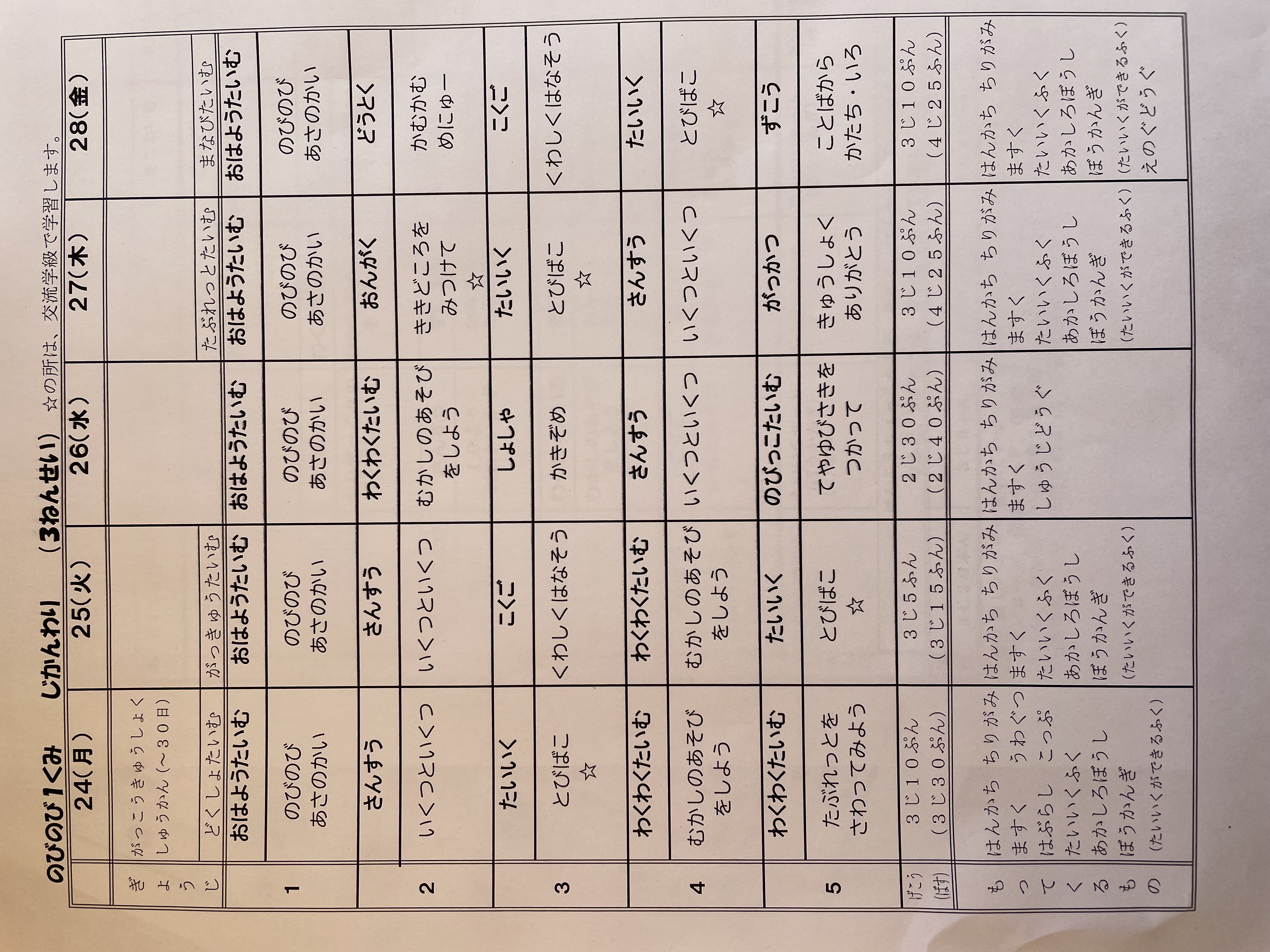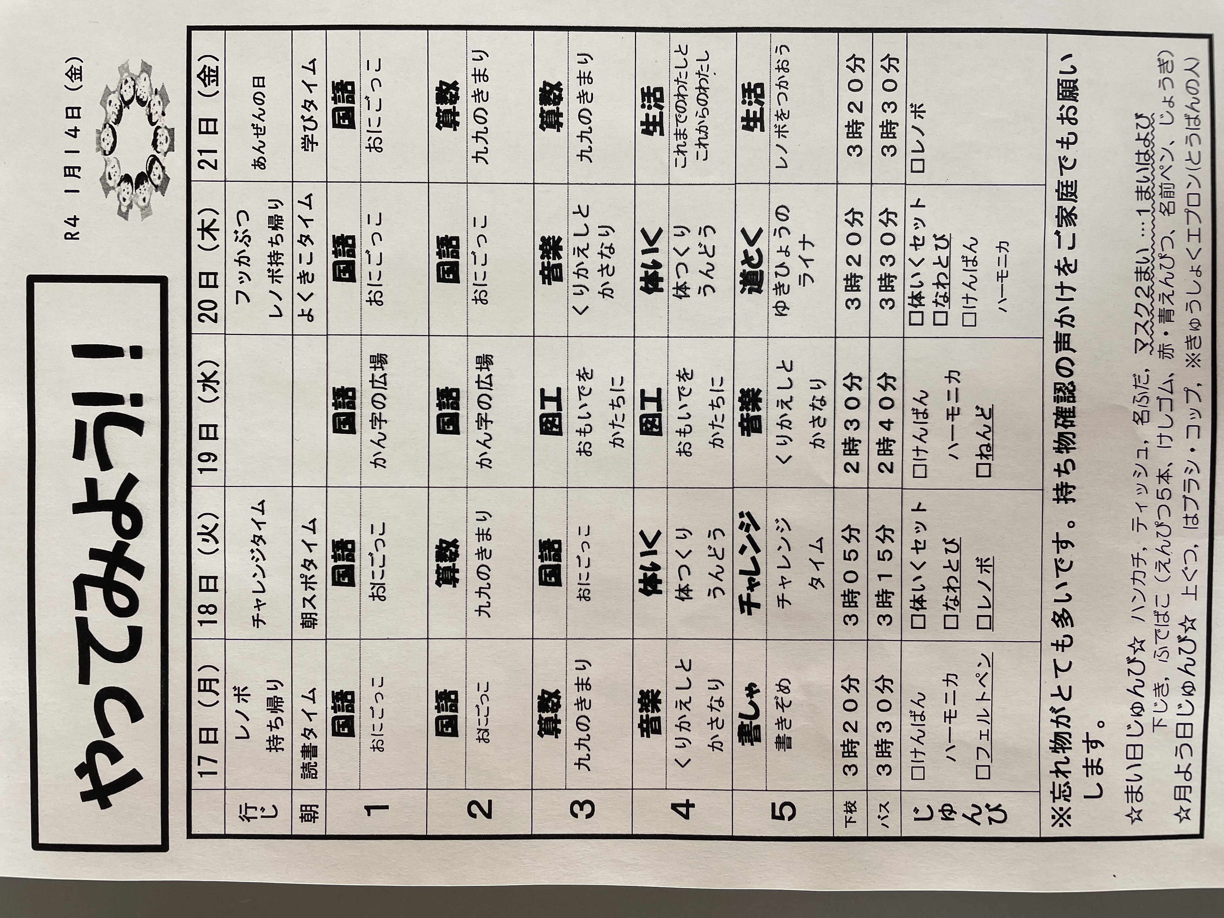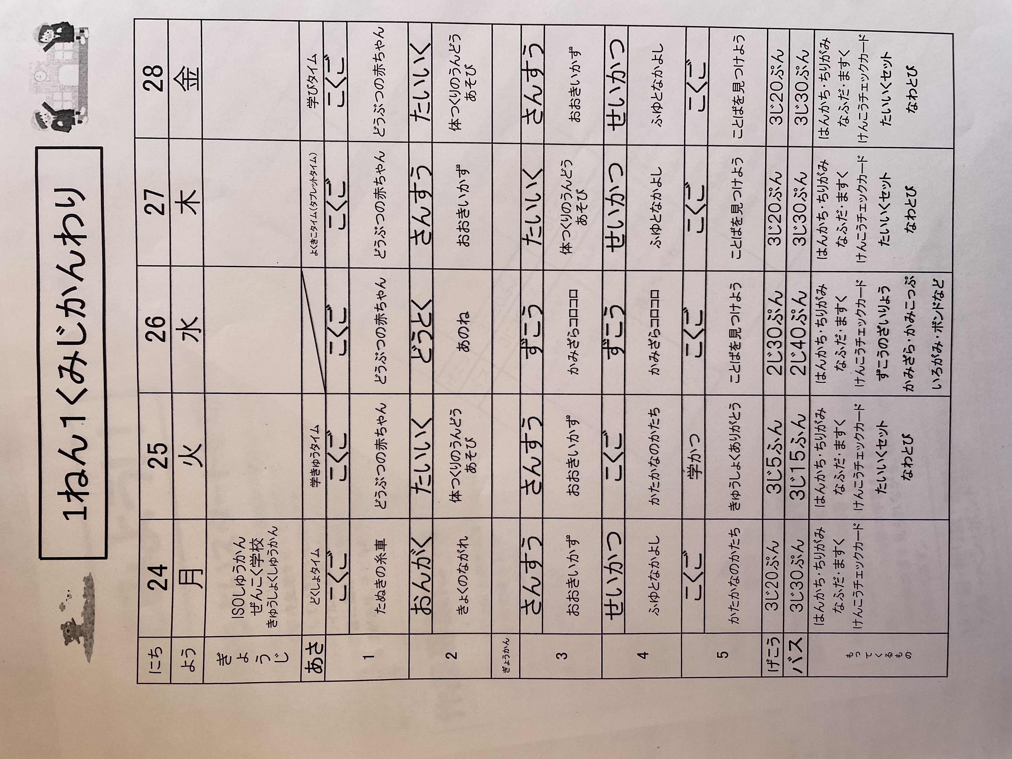 1月17日から1月21日までの時間割 投稿日時 : 2022/01/14 学校サイト管理者 1年1組.JPG 1年2組.JPG 2年1組.JPG 3年1組.JPG 4年1組.JPG 5年1組.JPG 5年2組.JPG 6年1組.JPG の1組1年.JPG の1組3年.JPG の1組5年6年.JPG の2組4年5年.JPG の3組1年.JPG の3組2年.JPG の3組3年.JPG の3組5年.JPG