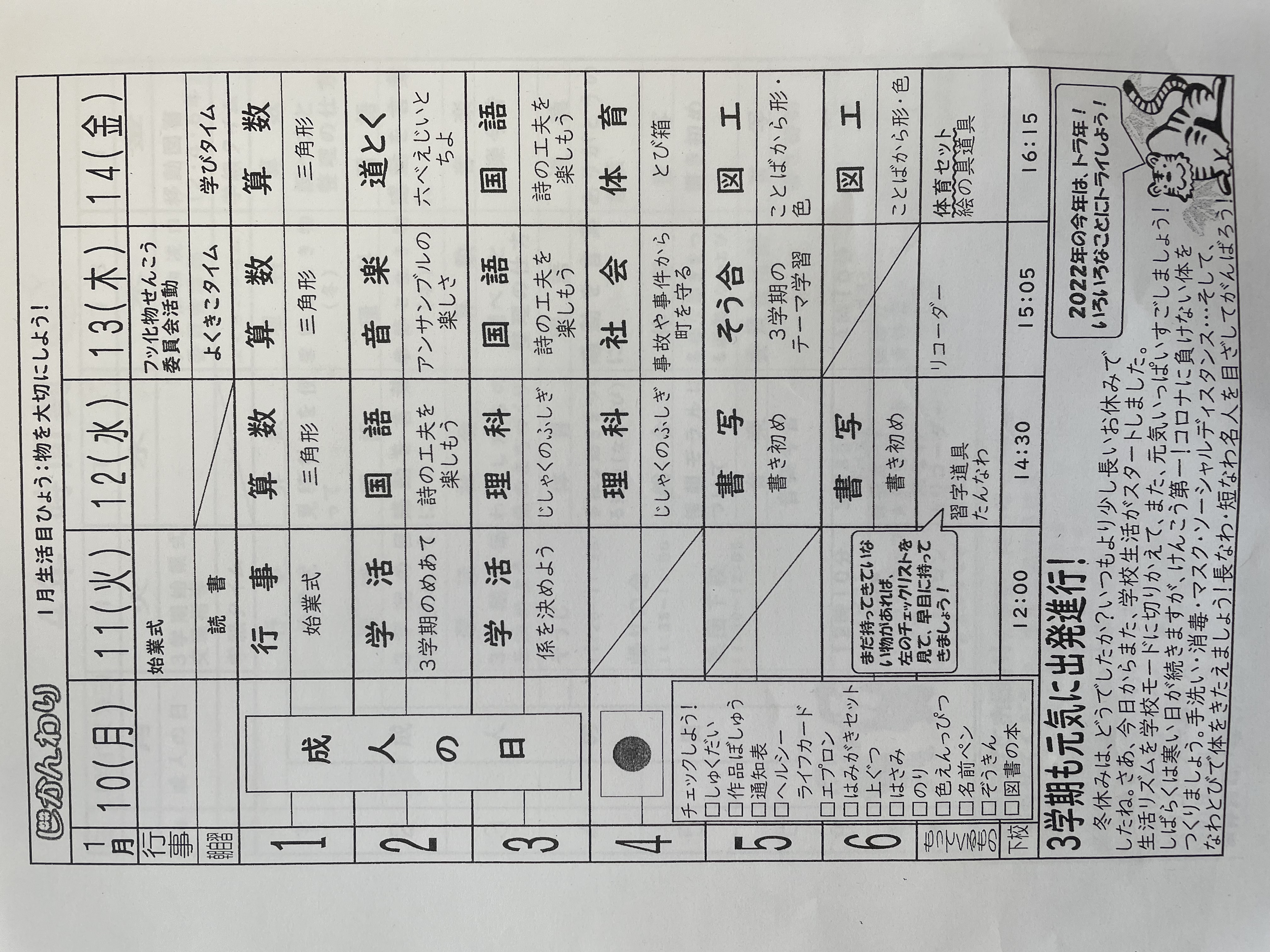 1月11日~1月15日までの時間割 投稿日時 : 2022/01/12 学校サイト管理者 1年1組.JPG 1年2組.JPG 2年1組.JPG 3年1組.JPG 4年1組.JPG 5年1組.JPG 5年2組.JPG の1組1年.JPG の1組3年.JPG の1組5年6年.JPG の2組4年5年.JPG の3組1年.JPG の3組2年.JPG の3組3年.JPG の3組5年.JPG