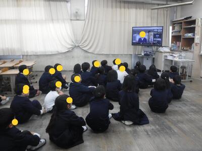 皆さん おはようございます 私からは冬休みの生活について話をします。先生方3人のまもる君については掲示板の連絡に載せていますので、必ずご指導をお願いします。それでは伝えたいことを話す前に3つのことを確認します。できている人は大きく うなずいてください。