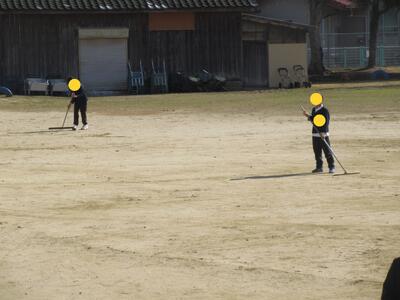 昼休み運動場の整備をしてくれている子どもたち。