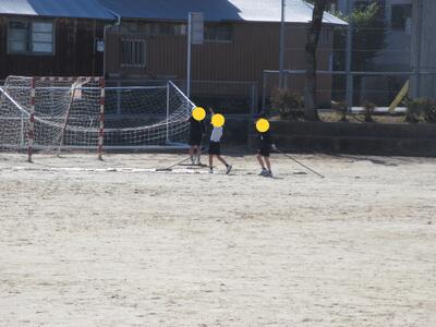 運動場で6年生の体育の授業の際に、参加できない子がライン引き等のサポートをしてくれていました。