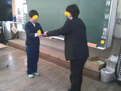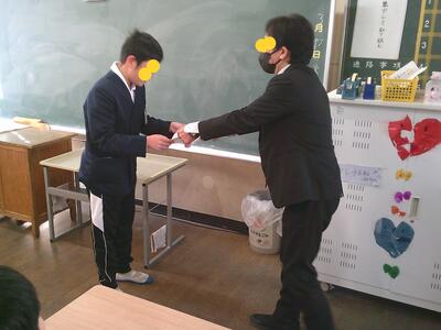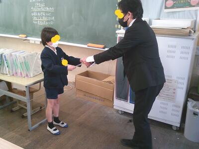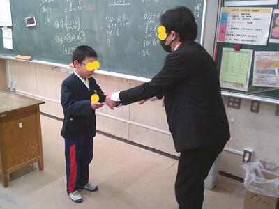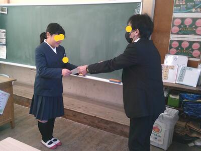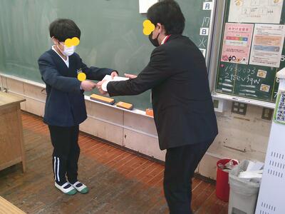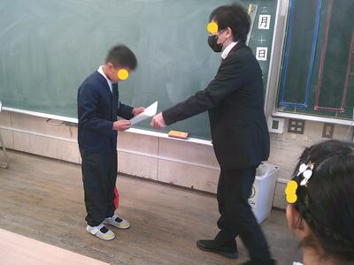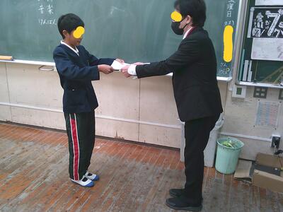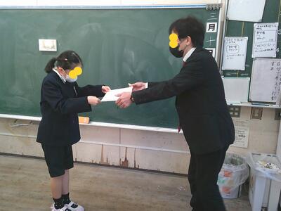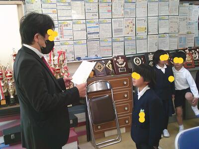 昼休みに、漢字計算大会ダブルパーフェクト賞表彰式です。