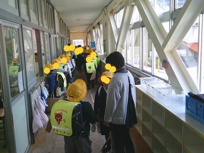 2回目の放送です。「2年生から6年生の児童のみなさんは、地区の教室へ、右側通行で静かに移動してください。」