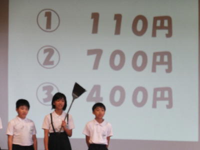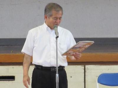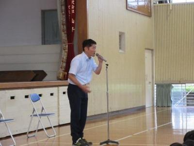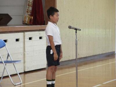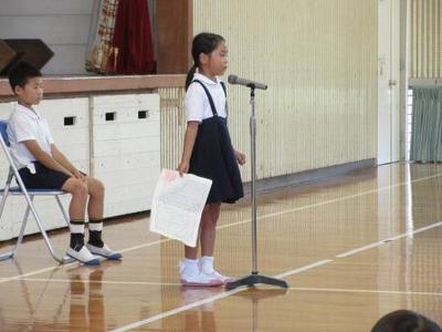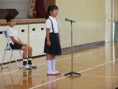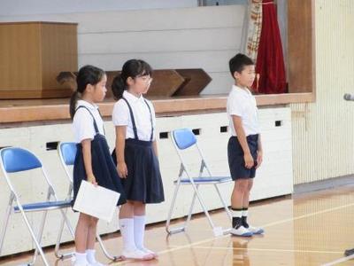 1・3・5年生の代表の児童が、全校児童の前で1学期のがんばりや2学期のめあて等を発表しました。