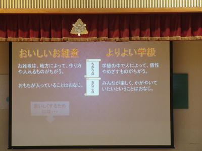 朝から「給食集会」、全校児童に向けて給食に関するお話をしていただきました。