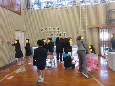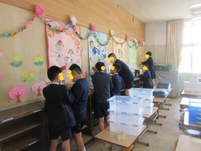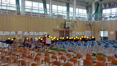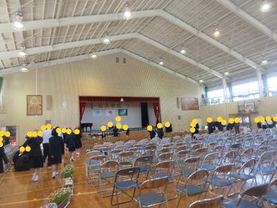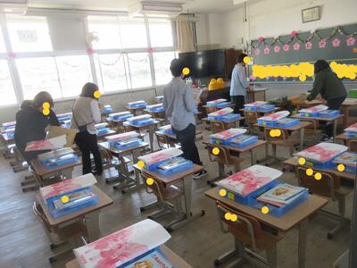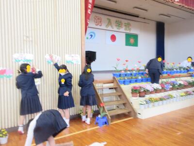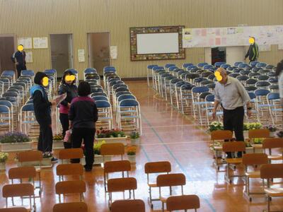 下校の見守りから学校に戻ると、入学式の準備をがんばる、6年生の子どもたちと先生たちの姿がありました。