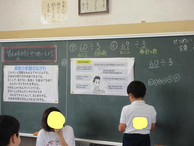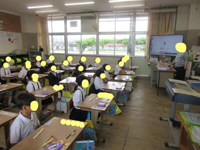 「時間を守る=始業を守る、1分着席」、「命を守る=ルールを守る、友だちの名前を大切にすること」、「きまりをまもる」の3人です。しっかりがんばりましょう。これも大切な学びです。