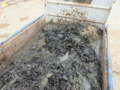 長靴を履いていた私は排水溝の泥上げのトラックの上へ。しかし私の長靴には穴が開いているという弱点があったため、泥の水分は長靴の中へ・・・。