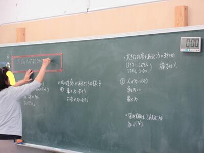町探検、実際に歩いて確認することも大切ですが、歩いて行くには時間的な制約、タイムロス、安全の確保等、効率的な学びを阻害する要因が発生します。これがグーグルマップを使えば効率的に確認ができます。例えば山間部のようすを確認したあと、平地部のようすを確認するには移動というタイムロスが発生するし、日を改めてとなれば学びの記憶もあやふやになります。しかしICTを上手に使えば、同時に山間部と平地部を参照し比較して気づきを発表することができます。