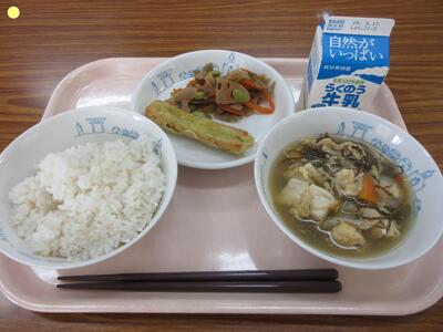 今日の給食は、牛乳とごはん、もずくのかき玉汁、五目きんぴら、ちくわの磯辺揚げ、でした。