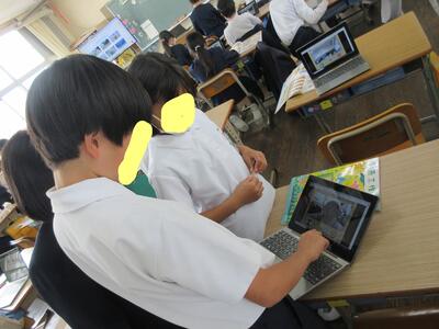 町探検、実際に歩いて確認することも大切ですが、歩いて行くには時間的な制約、タイムロス、安全の確保等、効率的な学びを阻害する要因が発生します。これがグーグルマップを使えば効率的に確認ができます。例えば山間部のようすを確認したあと、平地部のようすを確認するには移動というタイムロスが発生するし、日を改めてとなれば学びの記憶もあやふやになります。しかしICTを上手に使えば、同時に山間部と平地部を参照し比較して気づきを発表することができます。