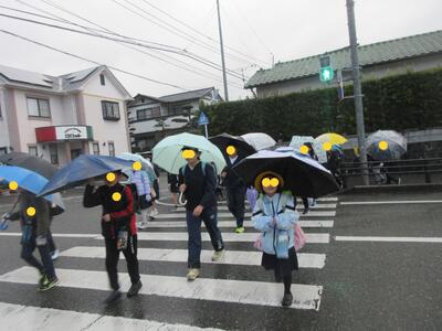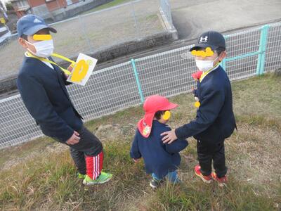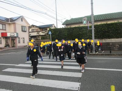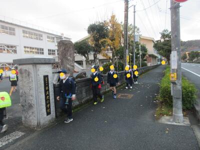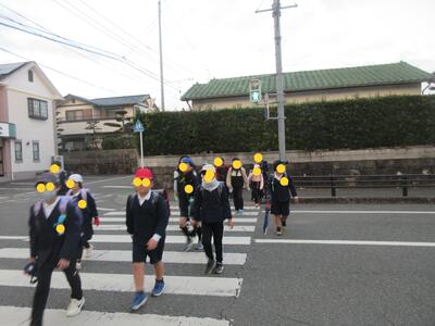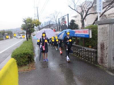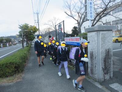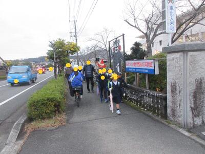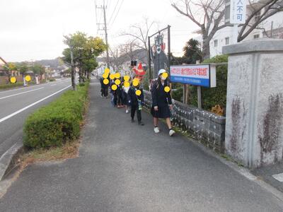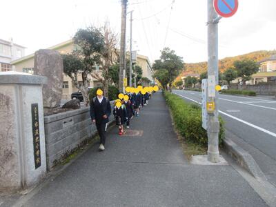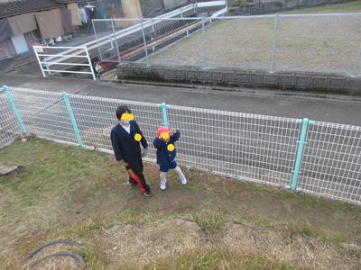 正門前で転んだ子がいて、走り寄って励まし立ち上がるまでの間、ずっと手を握ってくれた子がいました。優しいねと言うと「弟ですから」とステキな返事が返ってきました、の後ろ姿です。ステキですね、竈門炭治郎のセリフみたいですね。