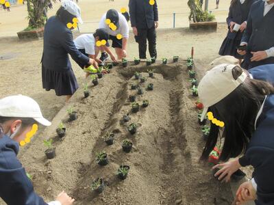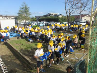 教室で準備して、チューリップを植えに来た1年生、このチューリップが新しい1年生を迎えますよ。入学から春で1年、これが1年生のブレーブストーリー。