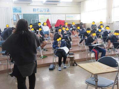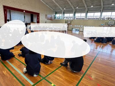 担当の先生から体育館の地区三班のしっかり話を聞いている様子の写真を送ってもらいました