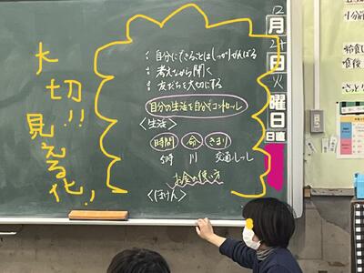 私が 二学期頑張ったことは次の学習の準備をすることです。休み時間に次の時間では何がいるのかを自分で確認しました。そしてノートに日付や課題を書く準備をしました。それ だけではなく自学での予習も頑張りました。授業の中で「あっここは自学でしたところだ。わかる、解ける。」と自信を持って学習に向かうことができました。一学期よりも授業が楽しいと思うことができたので三学期も学習の準備と予習をがんばりたいです。二学期クラスで頑張ったこともあります。それは助け合いです。初めは恥ずかしくあまり出来ていませんでした。そこで授業の中で教え合いをしたり、週に一回全員遊びをしたりして、みんなでクラスの中を深めていきました。すると困っている人を見かけたらすぐに行動できる人が増えてきました。助け合いは自分も相手も嬉しい気持ちになることをみんなで気がつくことができました。二学期を終え、私は目標をたてました。それは無言掃除をすることです。私は無言掃除Xデーの時に友達と喋ってしまうことがありました。なので三学期は月の始めに掃除の仕方を確認し、無言掃除ができるようにしたいです。最後に三学期のクラスでの目標をたてました。それはダブルパーフェクト賞を20人以上とることです。二学期にも同じ目標を立てて頑張りました。すると16人がダブルパーフェクト賞を取りました。一学期よりも多くの人がダブルパーフェクト賞を取ることができて、嬉しい気持ちもありましたが、悔しい思いもしました。目標を達成するためにみんなで宿題のプリントややり直しを一 生懸命頑張っていきたいです。