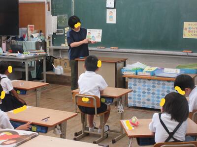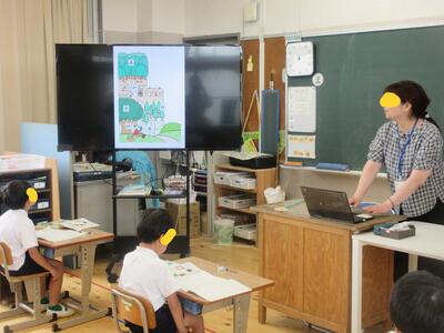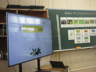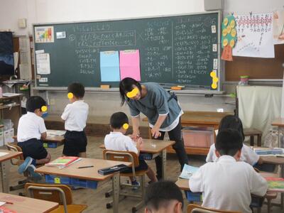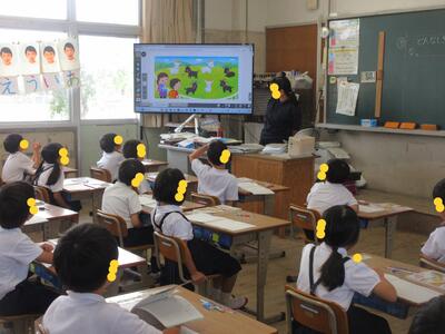 1年外国語活動、担任の先生とALTの先生のナイスコンビネーションです。