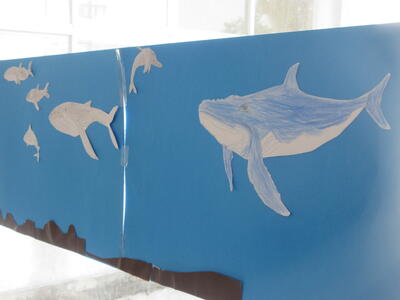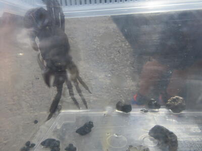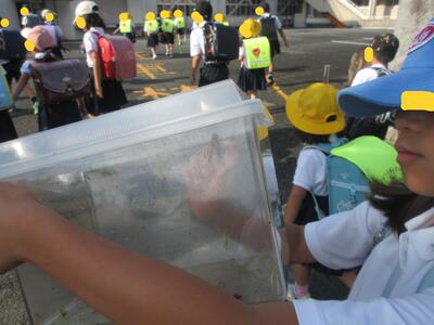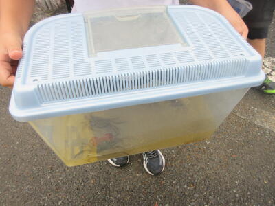 カニを捕まえて、大きな水槽を抱えて、登校してきました。