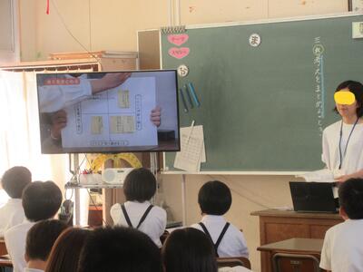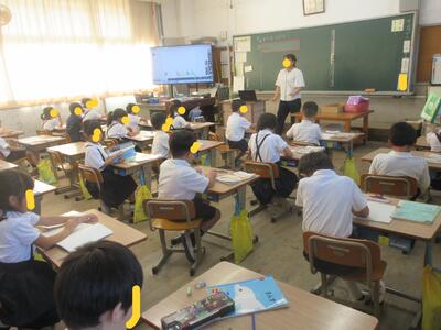 5年国語、動画を大いに活用です。動画を視聴させながら、先生は要点を板書にメモしていきます。