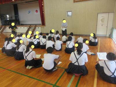 体育館で縦割り掃除に向けての打合せです。班長や6年生の役割は大切です。