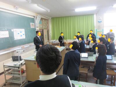 担当の先生から体育館の地区三班のしっかり話を聞いている様子の写真を送ってもらいました