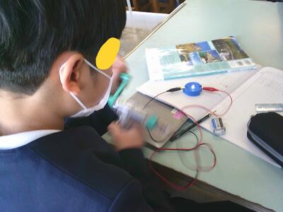6年理科、手回し発電で発電です。がんばれ。