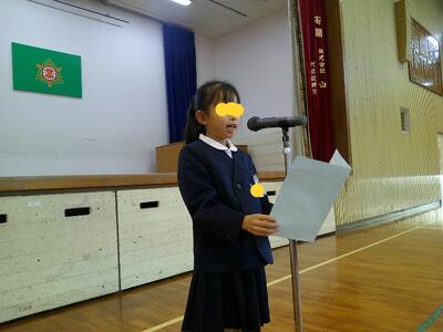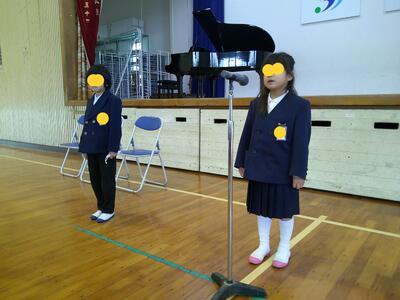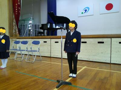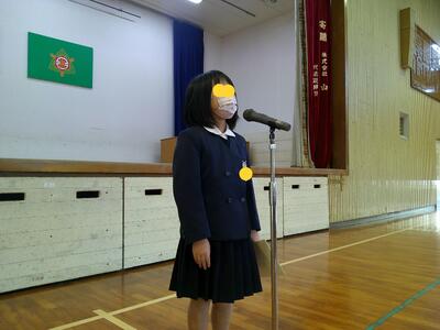 僕は、最高学年として、最後まで下級生のお手本になり、北小の伝統をしっかり残していきたいと思います。「3学期は次の学年の1学期」といわれています。だからこそ、 3学期から次の学年に向けて、一歩ずつ準備を始めていきます。来年、僕たちは中学生になります。 今、僕たちが下級生に堂々とした姿をみせることができれば、来年、その下級生が上の学年になったとき、新しく入ってくる1年生にとって力強いお手本になれることでしょう。こうやって、僕たちの行動で、北小のすばらしい伝統を残していきたいです。下級生のみなさん、僕たちの姿をしっかりと見ておいてください。これで終わります。