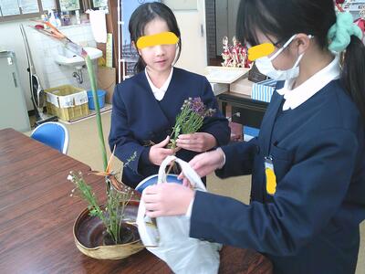 昼休み、生け花クラブの子どもたちが、生け花のお世話に来てくれました。