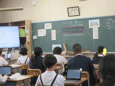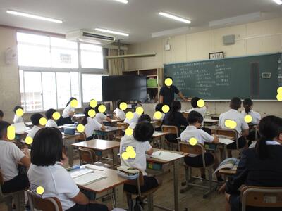 ひょんなことから、道徳の授業に参加して、道徳のワークシートの丸付けをしたら、みんなでお礼を言ってくれて、うれしくなっている校長のアングルからの一枚・・・。