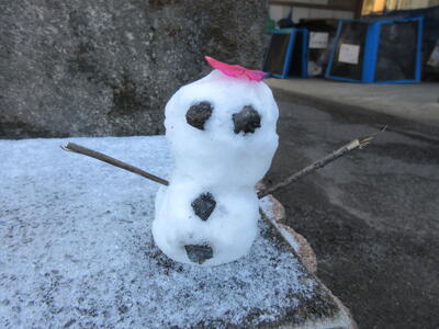 ある先生が「校長先生、駐車場にステキな雪だるまが飾ってあります」と教えてくれました。こちらです。
