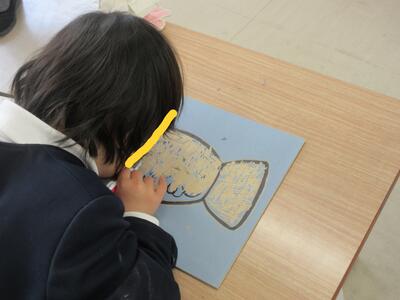 3年図工、綿が楽しそうで、楽しそうで。綿菓子屋、いやアーティスト。