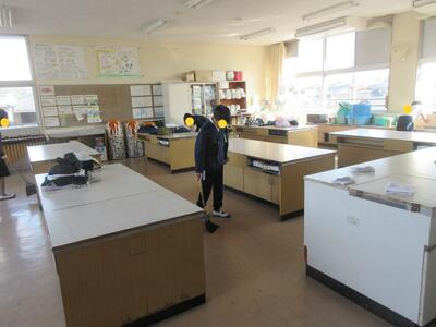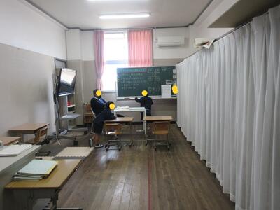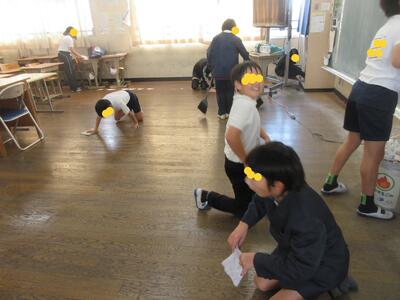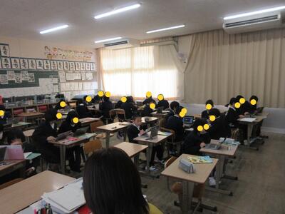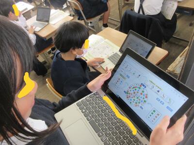 5年、生活の工夫?教室のいろいろな場所で工夫を話し合っているようです。