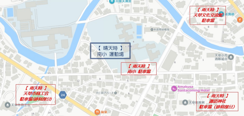 雨天時…本校駐車場,天草市商工会駐車場,天草文化交流館駐車場、諏訪神社砂利駐車場