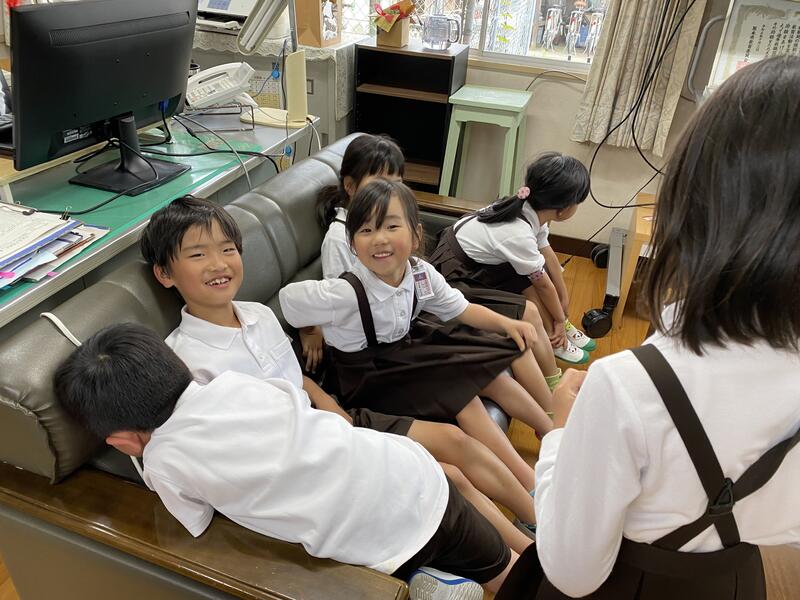 また、学校探検で校長室の中と理科室の中を見て、子どもたちはいろんな用具や写真等に興味津々でした。