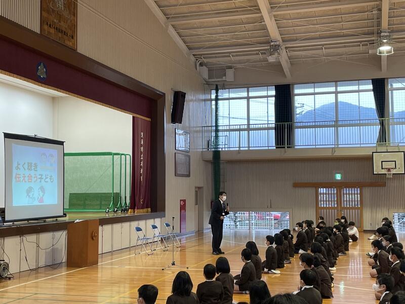 3月9日(水)、本渡町更生保護女性会5人の皆さんに、今年度で10歳になった4年生に「つなし」の節目としてお祝いの会をしていただきました。体育館で新型コロナウイルス感染防止の対策をしっかり取りながら行いました。