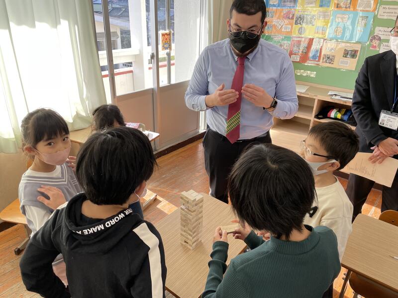 自己紹介の後は、ゲームを行ったり、タブレットを使ってクイズに答えたり、ジェンガをしたりなどなど、時間が経つにつれて、ALTの先生たち、子どもたちの緊張もとけ、笑顔いっぱいで楽しんでいました。