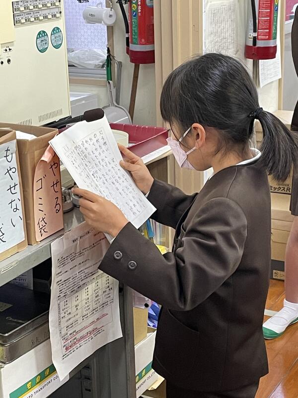 今日、保健室に1人の1年生の女の子が健康観察をもって立っていました。養護の先生を探している様子でしたが、その時養護の先生はいらっしゃらないようで、どうしたらいいかわからないで立っている様子でした。健康観察簿をどこに置いたらいいのかわからないのだろうと思い、「ここに置いたらいいよ。」と教えてあげると、その場所に健康観察を置き、その後すぐに、「教えてくれてありがとうございました。」と女の子が一言。その言葉を聞いて、思わずほっこりしました。感謝の言葉がすぐに言える南っ子。いつも人から何かをしてもらったら、感謝の言葉を言うことが習慣になっているから、すぐに言葉が出るのでしょうね。朝からうれしい出来事でした。