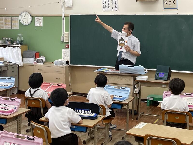 それぞれのクラスで、鍵盤ハーモニカの基本的な使い方(運指、息の吹き方)などを指導していただきました。子どもたちが知っている曲に合わせてテンポよく指導が行われていました。