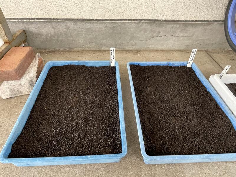 3週間もするとかわいらしい芽がでてきます。間引きをしながら育てていき、9月になったらポットに移植して苗作りを行う計画です。暑さが厳しいとせっかく芽がでても枯れてしまします。今が、一番気をつかいます。