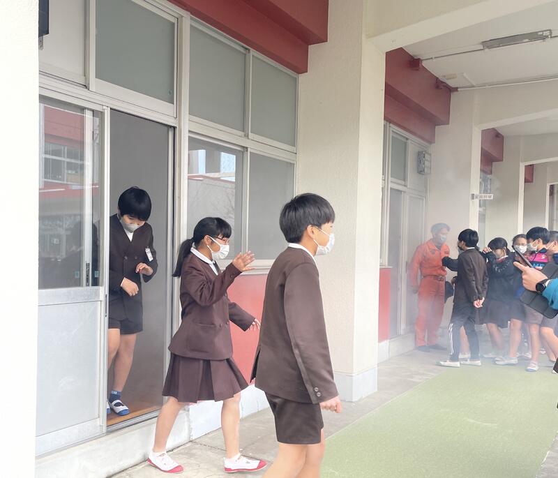 6年生は、けむり体験を実施しました。壁沿いを歩いただけでしたが、視界が悪く、火事のこわさを実感したようです。