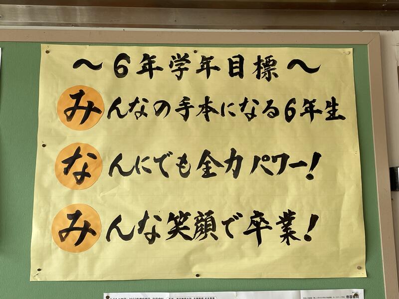 校内の特別教室、廊下、階段の壁面にはいろいろな掲示物があり、子供たちの「やる気スイッチ」をONにしてくれます。保健室近くの階段の踊り場には、5年生の学期毎の目標が掲示してあります。