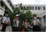 1学期に、学級園に植え、お世話をしていたひまわりが、大きく綺麗に咲いています。登校日にはじめて見た子どもたちは、「私の身長の3人分くらいあります!」「めっっっちゃ高いです!」と大興奮!