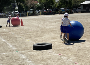 運動会に向けて、大玉転がしの練習をしています。二人で力を合わせて、コーンを上手くまわったり、アンカーはタイヤに大玉を乗せたり、子どもたちなりに工夫をして頑張っています。プログラム名は、「転がす?転がされる?大玉転がし」です。大玉に転がされることなく、一生懸命転がしますので、応援お願いします。
